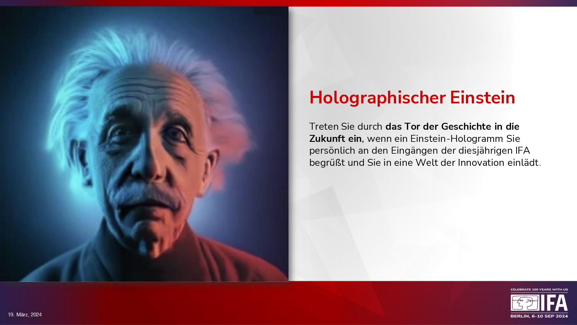 Nicht nur Einstein kehrt als Hologramm zurück, auch der Handel inklusive der Buying Groups wird deutlich mehr Präsenz zeigen als zuletzt. Euronics, expert, ElectronicPartner und EK Retail standen auch trotz vielstimmiger, berechtigter Kritik in den hinter uns liegenden Krisenjahren wie eine Bank zur Marke IFA und sind gesetzt.