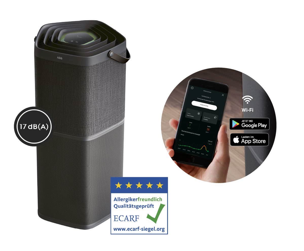 Der jüngst vorgestellte AEG AX9 bekommt im März 2021 gleich drei kleinere Geschwister, die auch kleinere Flächen und Geldbeutel mit sauberer Luft versehen – es muss halt kein über 300 qm großer Tanzsaal sein. AX7 und AX5 versorgen bis zu 60 qm, und das Einstiegsmodell AX3 reicht für 40 qm aus. Die beiden größeren Modelle sind wie der Erstling der Baureihe mit WLAN und App-Steuerung versehen, eine von der Raumluftqualität gesteuerte Automatik haben alle drei Nachzügler zu bieten.