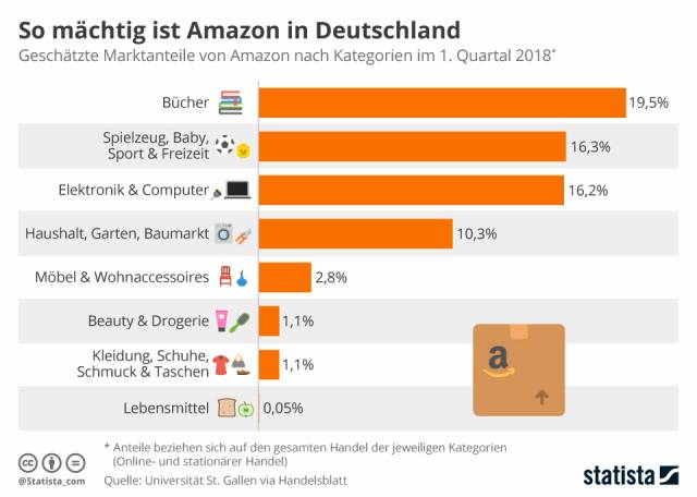Wo kaufe ich ein – bei Amazon oder der Konkurrenz? Diese Frage beantworten viele Deutsche zugunsten des E-Commerce-Riesen aus Seattle. Die Infografik von Statista zeigt auf Basis von Schätzungen der Universität St. Gallen wie groß die Marktanteile von Amazon in unterschiedlichen Kategorien sind. Die Werte beziehen sich dabei jeweils auf den gesamten Handel, also den Online- und stationären Handel.