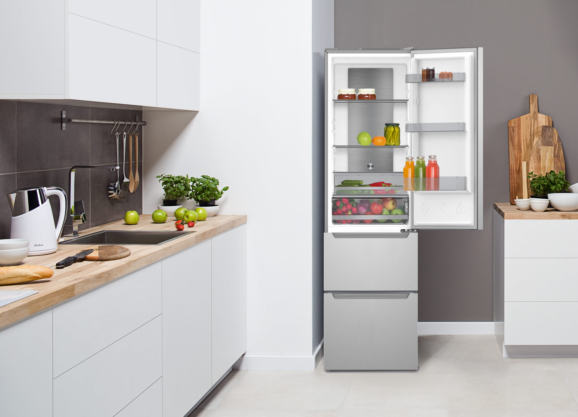 192 cm misst diese Kühl-Gefrier-Kombination und verbreitet mit 197 l Kühlvolumen und 85 l Gefrierkapazität, aufgeteilt in zwei große, von oben befüllbare Schubladen, ein besonderes Flair in der Küche. Dank der Energieeffizienzklasse D zeichnet sich das Modell zudem durch einen niedrigen Energieverbrauch aus. Ob im Kühl- oder Gefrierbereich, die NoFrost-Funktion macht das Abtauen und Enteisen überflüssig. Vor dem Einlagern größerer Mengen an frischen Lebensmitteln sollte die Superkühl- und Supergefrierfunktion eingeschaltet werden. Sie kühlt das Gerät tiefer herunter als üblich, so dass die die Temperatur im Gerät nicht zu sehr steigt. Gerade bei empfindlichen Lebensmitteln wie beispielsweise Fleisch, aber auch Beeren und anderen Früchten eine unverzichtbare Funktion, um Vitamine und andere Inhaltstoffe weitestgehend zu erhalten.