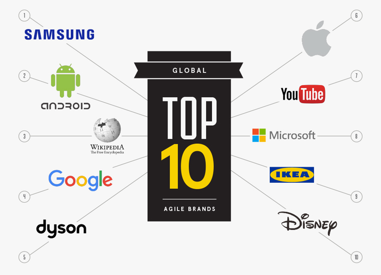 Samsung belegt Platz 1 der erstmalig durchgeführten „Global Agile Brand Studie“ und verweist Apple, das den Ruf eines innovativen Technologieführers genießt, auf Platz 6. Nach Samsung gehören Android, Wikipedia, Google und Dyson zu den Top 5. Auf Apple folgen YouTube, Microsoft, Ikea und Disney.