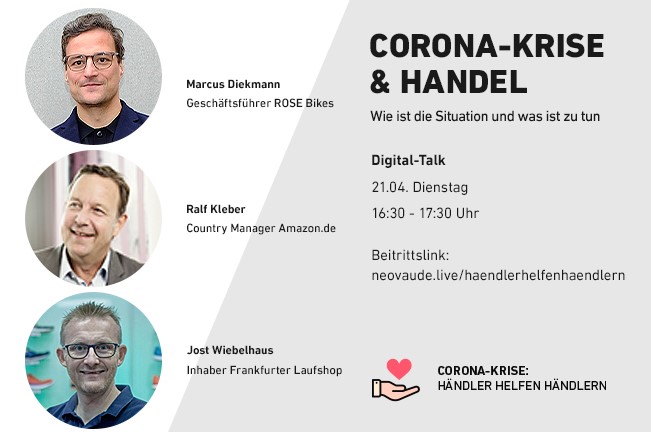 Über das Top-Thema „Wie wird der Handel in der Corona-Krise schnell verkaufsfähig?“ diskutieren am kommenden Dienstag, 21. April um 16.30 Uhr Ralf Kleber (Country Manager Amazon.de) und Jost Wiebelhaus (Inhaber Frankfurter Laufshop) sowie Marcus Diekmann (CEO Rose Bikes und Initiator von „Händler helfen Händlern“). Übertragen wird der Digitaltalk hier.