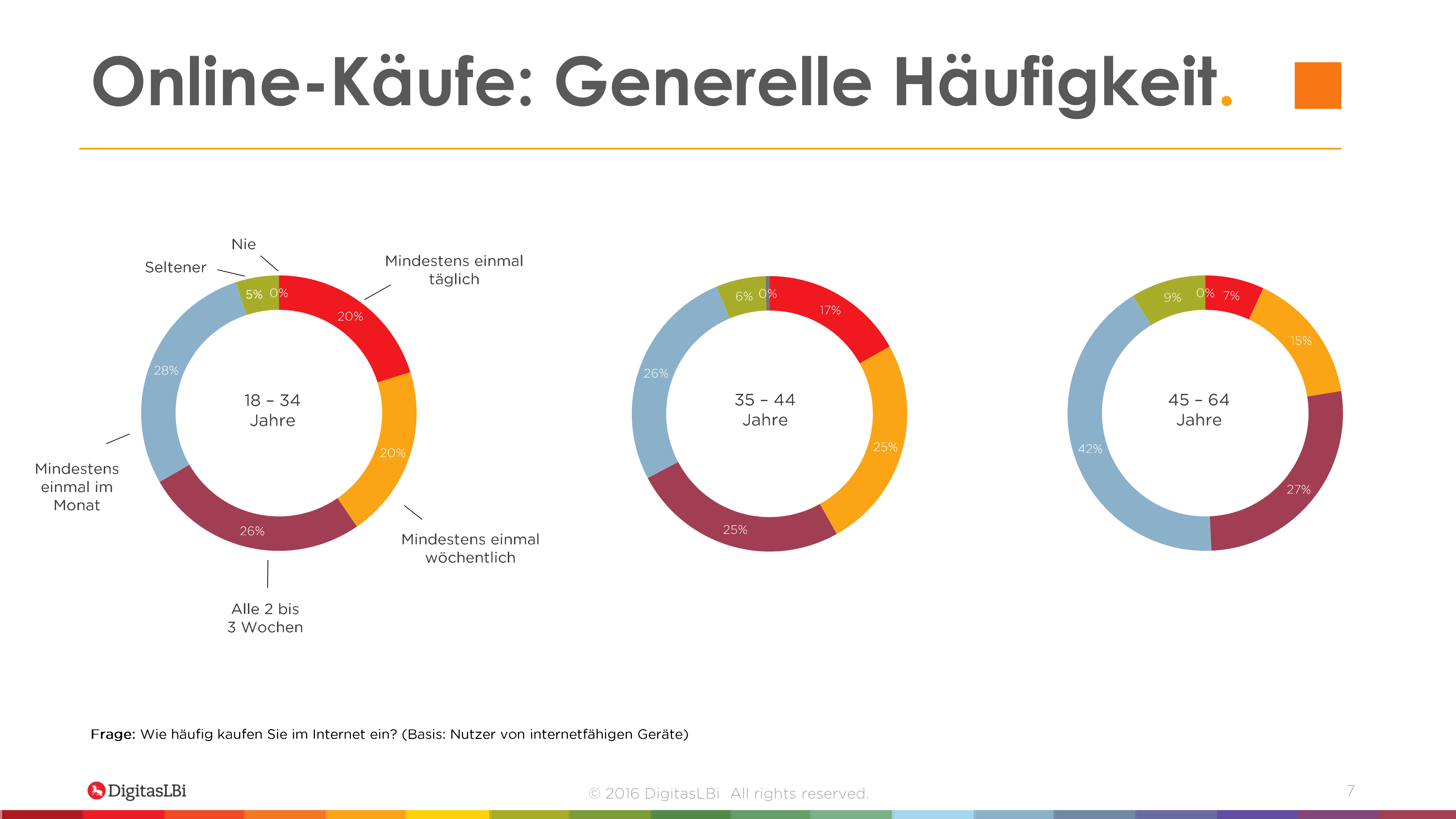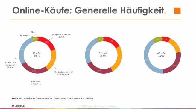 Die Möglichkeiten von digitalen Einkaufswelten überzeugen die Mehrheit der deutschen Verbraucher. Neun von zehn Internetnutzern (93 Prozent) kaufen gemäß der Untersuchung von DigitasLBi regelmäßig und bewusst im Internet ein. Jeder Zehnte (13 Prozent) bestellt bereits täglich Produkte und Dienstleistungen über das Internet und jeder Fünfte (19 Prozent) kauft mindestens einmal pro Woche gezielt online ein. Über ein Viertel (26 Prozent) kauft alle zwei bis drei Wochen und mehr als ein Drittel der Verbraucher (34 Prozent) mindestens einmal im Monat. Nur sieben Prozent der Verbraucher bestellen seltener als einmal im Monat.