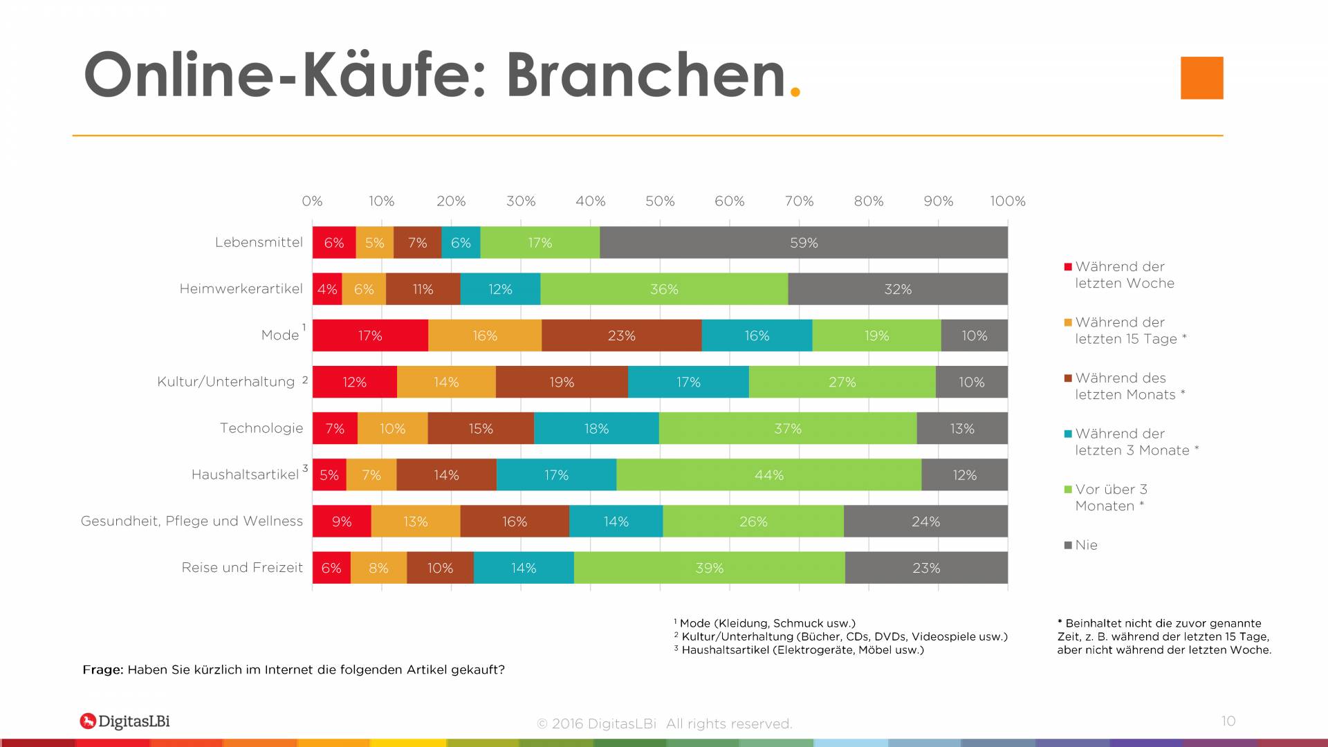 Am Häufigsten kaufen die Internetnutzer Modeartikel und Fashionprodukte sowie Kultur- und Unterhaltungsprodukte ein (jeweils 90 Prozent). Die meist ausgeprägte Einfachheit der Bestellvorgänge und die Tatsache, dass die Konsumenten im Mittelpunkt des Geschehens stehen, sorgt für ein überaus reges Interesse am Online-Handel. Im Fall von Modeartikeln sieht die Studie von DigitasLBi einen zentralen Grund in dem kostenfreien Zurückschicken von nicht passender Kleidung und Schuhen. Das unverbindliche Ausprobieren von online gekauften Artikeln nimmt für viele Verbraucher einen vergleichbaren Stellenwert ein wie die klassische Umkleidekabine.