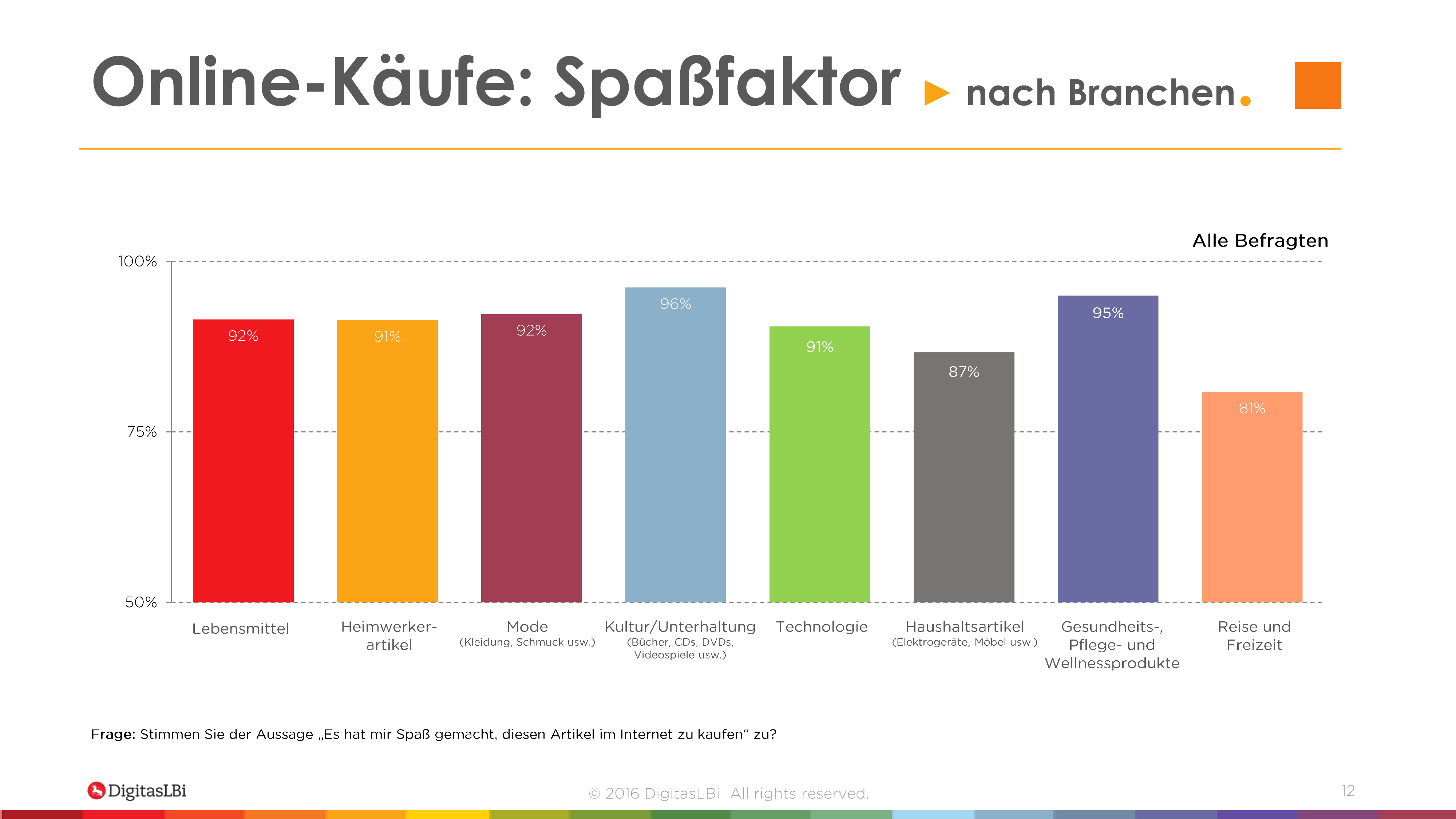 Neun von zehn Internetnutzern (90 Prozent) bestätigen, dass sie Spaß an ihrem Online-Einkauf haben. Die positive Wirkung des digitalen Einkaufserlebnisses zeigt sich in fast allen der acht untersuchten Branchen. Am meisten Freude bereiten Online-Käufe in den Bereichen Kultur und Unterhaltung (96 Prozent) sowie Gesundheits-, Pflege- und Wellness-Produkte (95 Prozent). Der Kauf von Lebensmitteln sowie Mode- und Fashionprodukten sorgt für Spaß bei 92 Prozent der Verbraucher. Nur die Kategorie Reise und Freizeit schwächelt mit einem unterdurchschnittlichen Spaßfaktor in Höhe von 81 Prozent. Laut der Untersuchung von DigitasLBi sorgen in diesem Marktsegment die unübersichtliche Darstellung auf Preisvergleichsseiten und die unterschiedliche Preisfindung für identische Produkte für Akzeptanzprobleme seitens der Verbraucher.