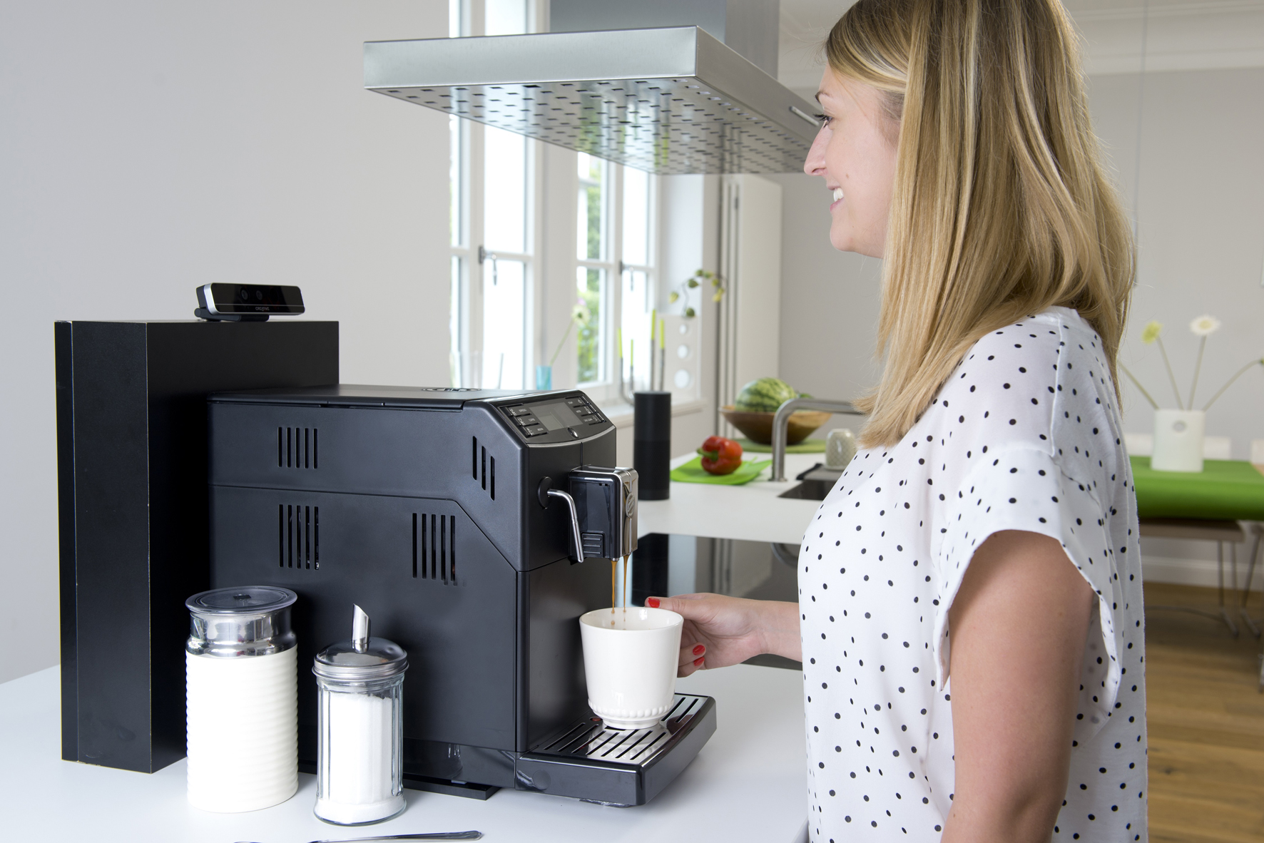 Der Showcase „Smile for a Coffee“ kombiniert eine Kaffeemaschine mit der 3D-Tiefenkamera RealSense von Intel sowie dem Smart Home-System von digitalSTROM. Die hochsensible Kamera liest dem Bewohner den Wunsch förmlich von den Lippen ab, denn sie erkennt selbst kleinste Veränderungen im Gesicht eines Menschen. Diese werden durch digitalSTROM in entsprechende Aktionen umgesetzt. Damit genügt ein Lächeln, um den Kaffeeautomaten zu starten. Jede andere Geste könnte ebenso einen entsprechenden Steuerungsbefehl für andere Geräte im Haus auslösen. Die neue Technologie kann insbesondere Menschen mit körperlichen Einschränkungen unterstützen und als Assistenzsystem für altersgerechtes Wohnen dienen.
