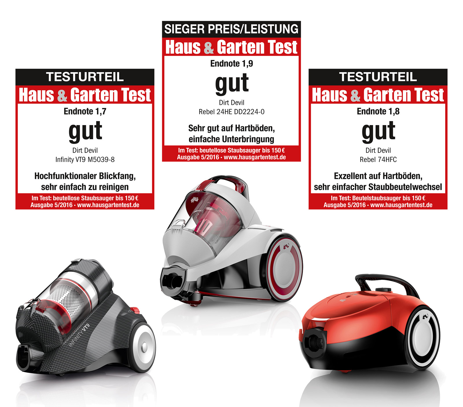 In der Kategorie „beutellose Staubsauger bis 150 € Marktpreis“ nahm Haus & Garten Test zwei Dirt Devil-Modelle unter die Lupe. Mit dem Testurteil „gut“ und der Endnote 1,9 sicherte sich der Rebel 24 HE die Auszeichnung „Sieger Preis/ Leistung“. Das Fazit der Tester: „Vor wenigen Jahren war ein so kompakter und preiswerter Staubsauger wie der 24HE eine Utopie, selbst beim Betriebsgeräusch fällt er nicht störend auf und liegt deutlich unter dem Pegel der Lärmmacher der Vergangenheit.“