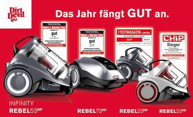 Bestätigt wurde das starke Leistungspaket der Dirt Devil Staubsauger auch von der Redaktion „Haus & Garten Test“, die den Multicyclone-Staubsauger Infinity Rebel 53HF und den Beutelsauger Rebel 73HF unter die Lupe nahmen. „Rundum solide zeigen sich der Infinity Rebel 53HF und der Rebel 73HF, an Saugleistung mangelt es beiden nicht, die Funktionalität ist ganz klar gegeben und die Bedienkonzepte wissen zu überzeugen“, urteilt das Magazin.