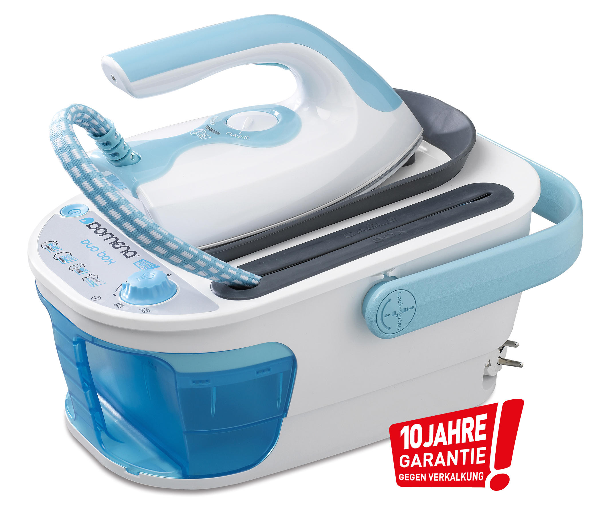 Die Domena Dampfbügelstation Duo Box mit der „EasyTemp“ – Technologie ist das Kernstück des neuen Bügeleisens „Duo“. Nur noch zwei Funktionen (und ohne weitere Temperatureinstellungen) sorgen für perfekte Bügelergebnisse: Einstellung „Classic“ (140° Bügelsohlen-Temperatur) wird verwendet zum Bügeln aller Stoffe, Einstellung „Pressing“ (180° Bügelsohlen-Temperatur) zum Bügeln problematischer Stoffe (z.B. Leinen) und für vertikales Bügeln.
