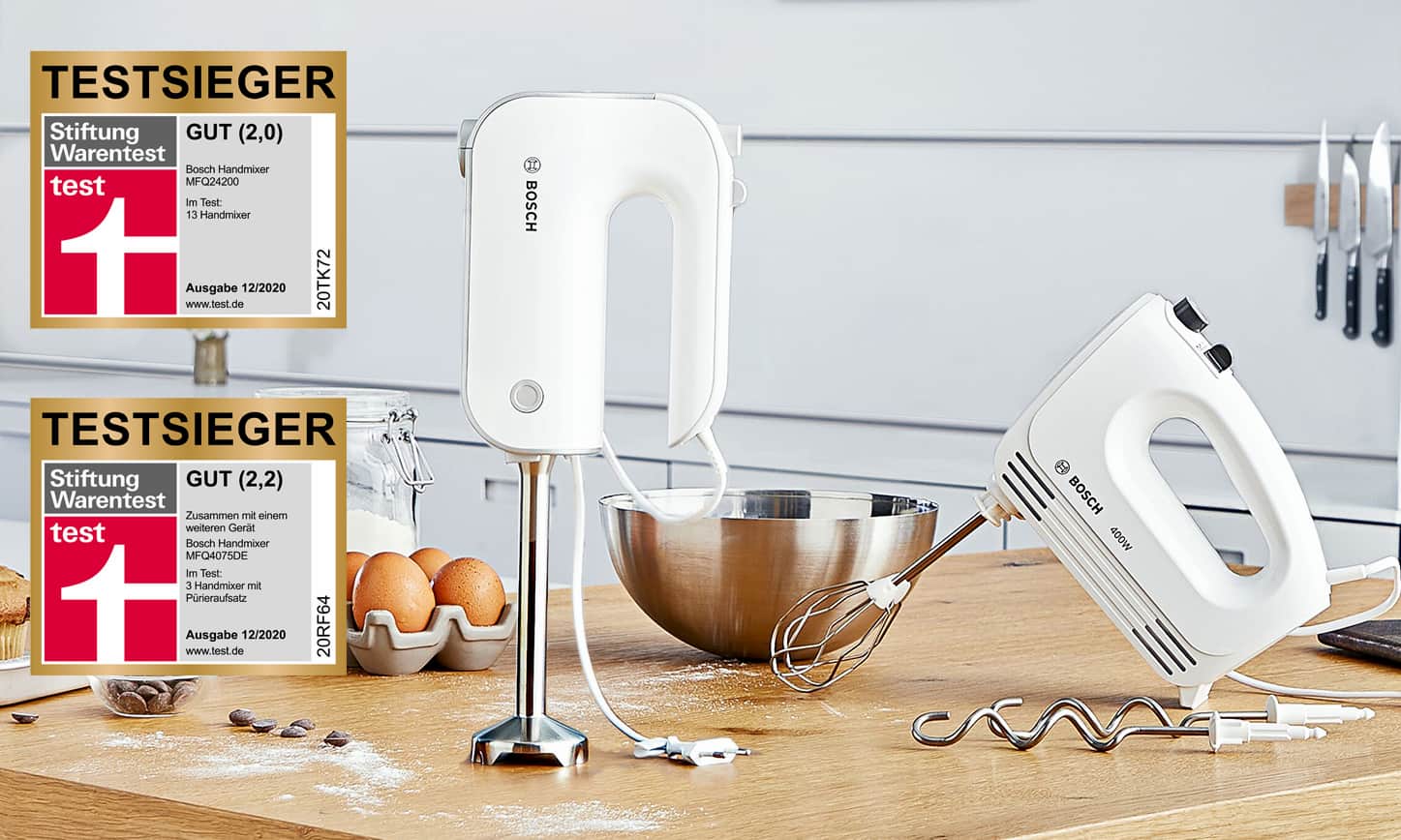 Gleich zweimal steht beim aktuellen Handmixer-Test der Dezember-Ausgabe der Stiftung Warentest (StiWa) ein Gerät von Bosch auf dem ersten Platz. Der CleverMixx MFQ24200 gewinnt in der Kategorie „Handmixer“ mit der Note „gut“ (2,0). In der Kategorie „Handmixer mit Pürieraufsatz“ belegt der Styline MFQ4075DE mit der Note „gut“ (2,2) ebenfalls den ersten Platz.