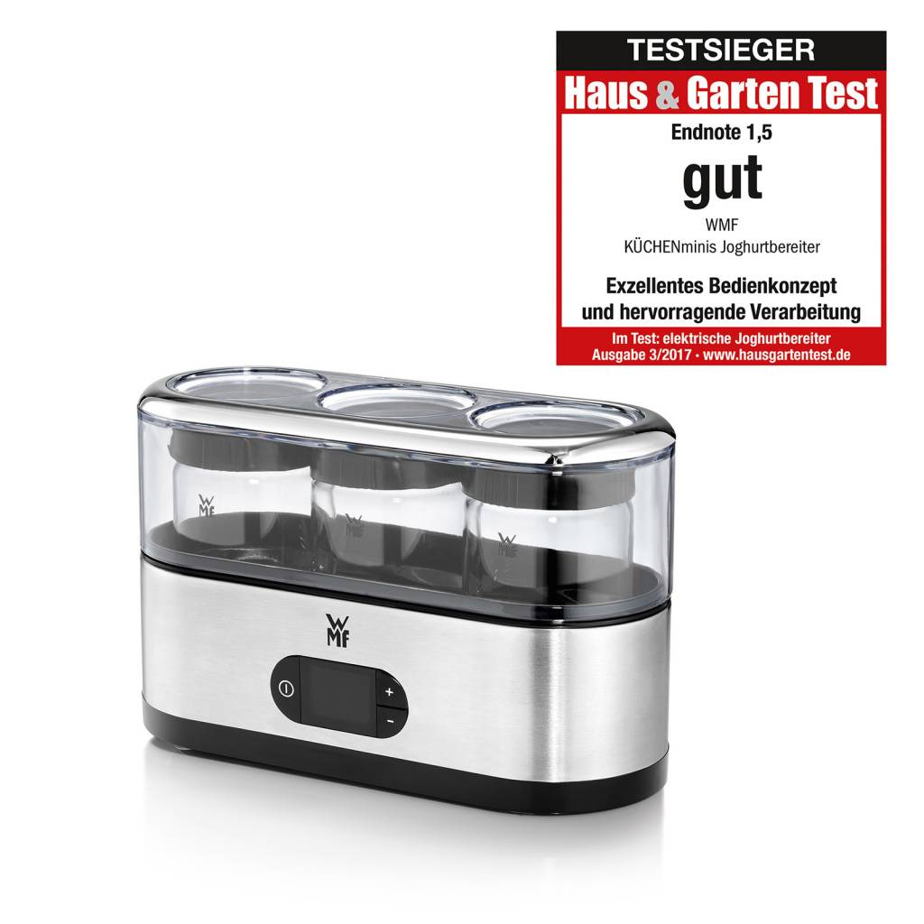 Im Testfeld der Joghurtbereiter traten fünf Kandidaten an. Testsieger wurde mit dem Urteil „gut“ (Note 1,5) der WMF KÜCHENminis Joghurtbereiter. „Bei einer mittleren Temperatur von 44 Grad Celsius produziert der WMF-Bereiter in sechs Stunden sehr gleichmäßigen Joghurt. Der Energieverbrauch liegt auf einem sehr effizienten Niveau und das Bedienkonzept ist hervorragend. Mit Blick auf die Verarbeitung sticht der WMF-Bereiter hervor“, urteilten die Tester.