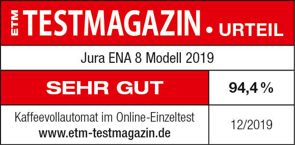 Jura-ETM_LabelDie Jura ENA 8 mit Touch-Funktion hat in der Ausführung Signature Line Massive Aluminium beim Sondertest des ETM Testmagazins in der Online-Ausgabe 12/2019 die Bestnote „sehr gut“ mit 94,4 von 100% erreicht. Zudem bekam der Eintassen-Vollautomat einen der begehrten Healthy Living Awards in der Kategorie „Kitchen“.