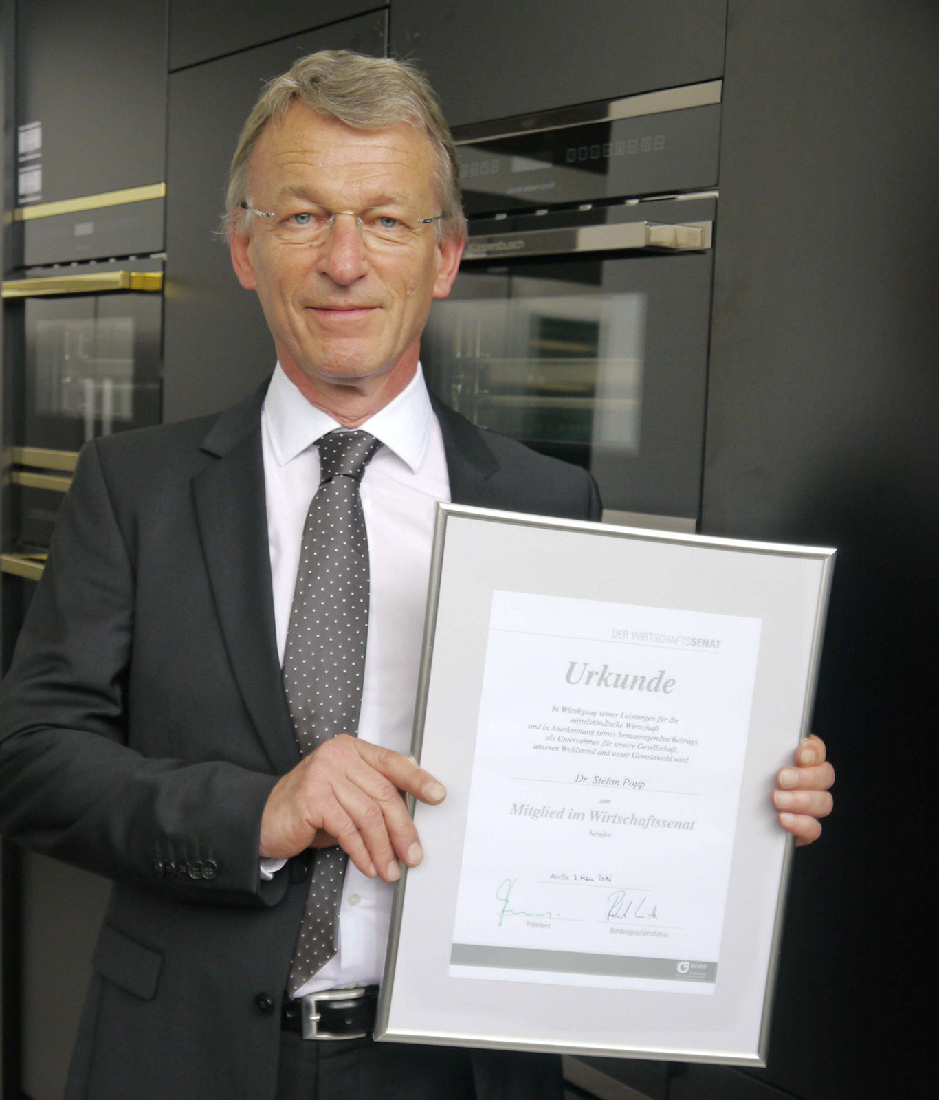 Der Bundesverband mittelständische Wirtschaft (BVMW) hat Dr. Stefan Popp, Geschäftsführer der Küppersbusch Hausgeräte, „in Würdigung seiner Leistungen für die mittelständische Wirtschaft“ zum Mitglied im Wirtschaftssenat berufen. Der BVMW ist der größte, freiwillig organisierte Mittelstandsverband in Deutschland. Er vertritt im Rahmen seiner Mittelstandsallianz die Interessen von über 270.000 Unternehmen, die über neun Millionen Mitarbeiterinnen und Mitarbeiter beschäftigen.