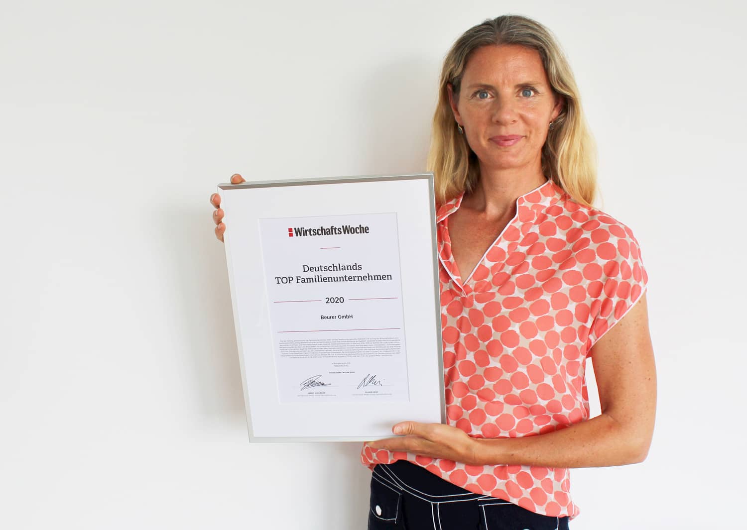 Die WirtschaftsWoche kürt Beurer zu „Deutschlands Top Familienunternehmen 2020“. In einer neuen Studie belegt das Ulmer Familienunternehmen Platz 6 von ursprünglich 500 bewerteten Mittelständlern. Marketingleiterin Kerstin Glanzer nahm die Urkunde für Beurer in Empfang.