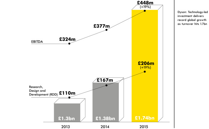 Die weltweite Nachfrage nach Technologien von Dyson hat den Umsatz um 26 % auf 1,7 Mrd. Pfund (rund 2,2 Mrd. Euro) gesteigert. Gleichzeitig erhöhten sich der Gewinn um 19 % auf 573 Mio. Euro und die Investitionen in neue Technologien auf 264 Mio. EUR. Das Wachstum im Jahr 2015 wurde weltweit durch den Einsatz fortschrittlicher Akkus in der Staubsaugertechnologie getrieben und einer Ausweitung des Produktportfolios „Environmental Control“, vor allem Luftreiniger und Luftbefeuchter in Asien. Dabei hat sich das Wachstum in China mehr als verdreifacht (222% in 2015), Europa wuchs um 38 % und in Deutschland verzeichnete Dyson ein Wachstum um 46 % (bezogen auf das Volumen).