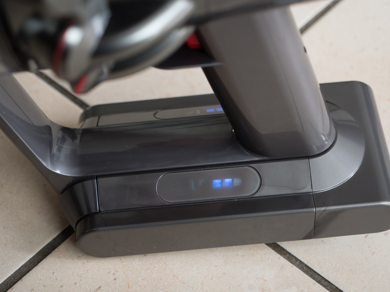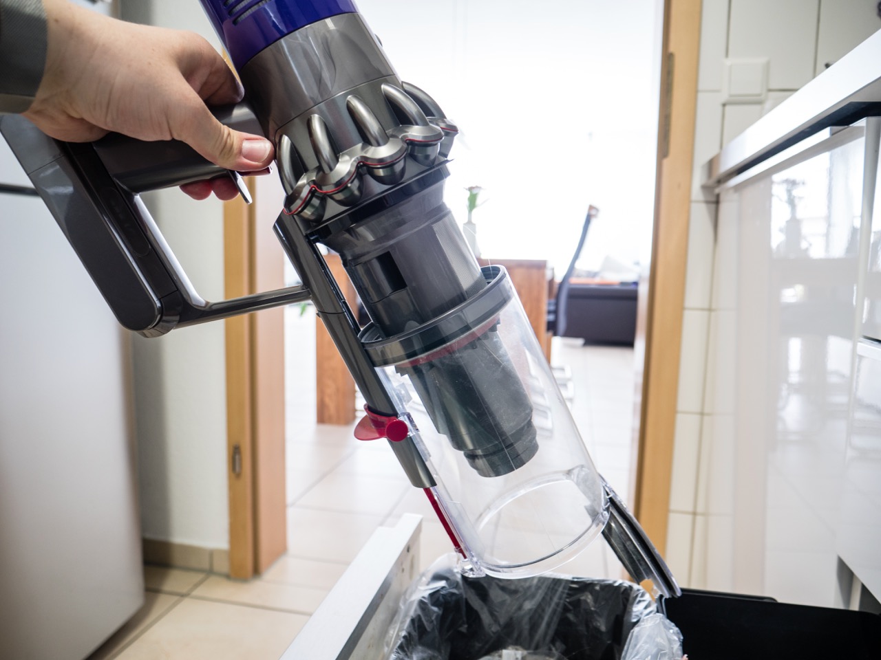Was mir im Vergleich zu den Vorgängermodellen sonst noch positiv aufgefallen ist? Der Staubbehälter wurde um 40 Prozent vergrößert und fasst nun 0,76 Liter. Entscheidend ist allerdings, dass sich der Behälter beim V10 auch deutlich einfacher entleeren lässt. Mit einem Handgriff landet alles im Mülleimer. Man muss nichts mehr händisch aus dem Behälter friemeln, wie das beim V6 noch der Fall war. Zudem ist das Sauggeräusch des V10 nicht mehr so aufdringlich und es gibt insgesamt drei Saugstufen (anstatt einer Turbo-Taste).