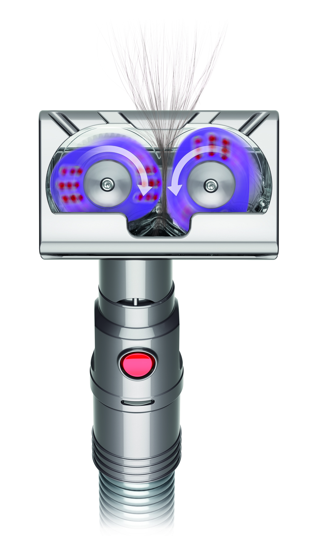 James Dyson: „Wir stecken genau so viel Entwicklungsarbeit in unsere Zubehörteile wie in unsere Staubsauger. Nach der Dyson Groom Hundebürste haben wir unsere Ingenieure beauftragt, ein anderes `haariges‘ Problem zu lösen. Wir haben herausgefunden, dass Haare verklumpen, wenn man sie kreisförmig gegeneinander reibt. Diese Haarknäuel kann man dann leicht entfernen. Wir haben deshalb die Bürstwalze in der Turbinendüse mit zwei gegenläufig rotierenden Bürstköpfen ausgestattet und damit die Leistungsfähigkeit unserer Staubsauger verbessert.“