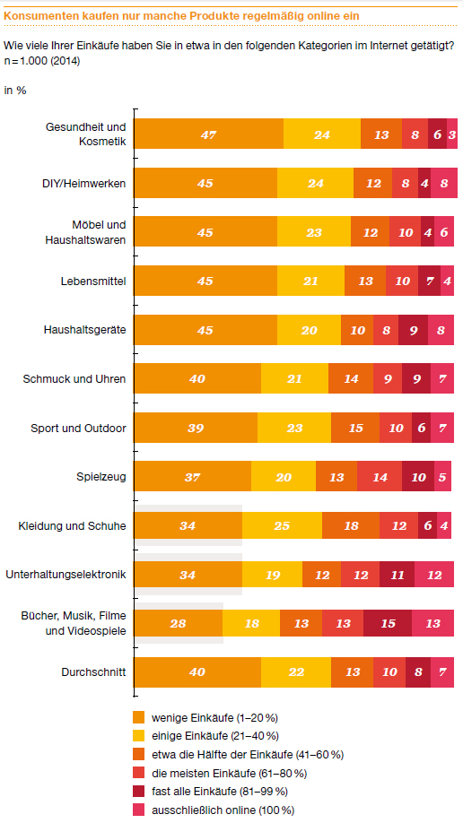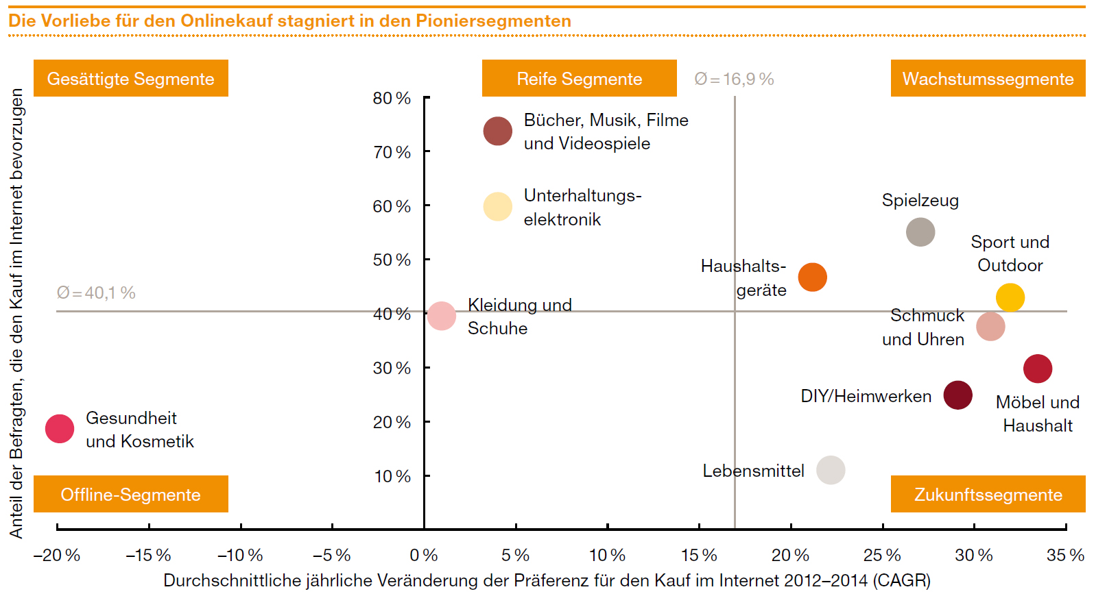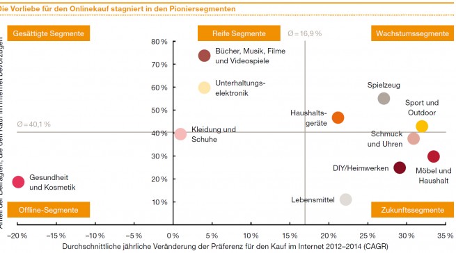 So stellt PwC fest, dass der Anteil der Konsumenten, die lieber im Internet als im Geschäft einkaufen, nicht mehr in allen Produktkategorien wächst. Darunter befindet sich auch das Segment Unterhaltungselektronik. Waren es im Vorjahr noch 62 Prozent, die vorzugsweise online Unterhaltungselektronik kauften, so schrumpfte dieser Wert um 2 Prozentpunkte auf aktuell 60 Prozent. Die PwC-Experten schließen daraus eine erste Sättigungstendenz, die sich insbesondere bei Branchen zeige, die sehr früh hohe Onlineanteile aufwiesen. Neben Unterhaltungselektronik gehören zu den sogenannten „Reifen Segmenten“ Bücher, Musik und Filme.
