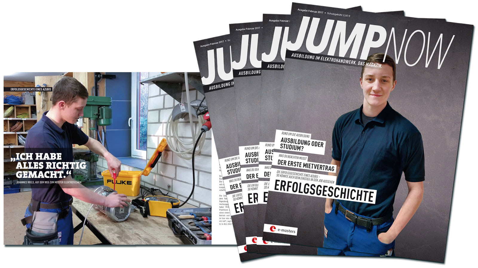 „Jump Now“ erscheint drei Mal im Jahr und soll jungen Menschen die Berufsausbildung beim Elektro-Profi näher bringen und den e-masters Fachbetrieben dabei helfen, neue Auszubildende zu gewinnen und an ihren Betrieb zu binden. Die e-masters Mitglieder können das Heft mit eigenem Firmenaufdruck bestellen. Als lokales Unternehmen nutzen sie es dann beispielsweise zur Verteilung auf Azubi-Messen, in Schulen, im Kino oder bei Vereinen – eben überall dort, wo sie junge Leute finden.