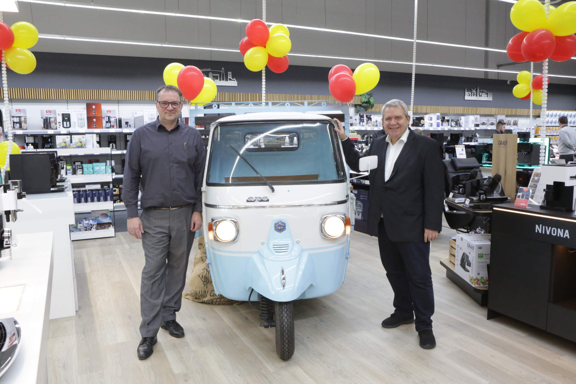 Von außen ein nüchterner Zweckbau, den sich Verporten mit dem Frequenzbringer Lidl (auch ein Rewe-Markt, Fressnapf und der örtliche Bahnhof der pittoresken Stadt am Niederrhein sind nur einen Steinwurf entfernt) teilt, setzt unmittelbar beim Betreten des Medimax-Fachmarktes der Wow-Effekt ein. Als Wachmacher und Hingucker linkerhand zum Auftakt das Genussthema Kaffee. Das lässt sich kaum stilvoller inszenieren als mit einer Ape, jenes dreirädrige Rollermobil mit Kultstatus des italienischen Herstellers Piaggio. Auf der Ladefläche entdecken wir u.a. Siebträger und Vollautomaten von De’Longhi, Jura und Nivona (die in Kempen einen aufmerksamkeitsstarken wie bemerkenswerten Auftritt haben).