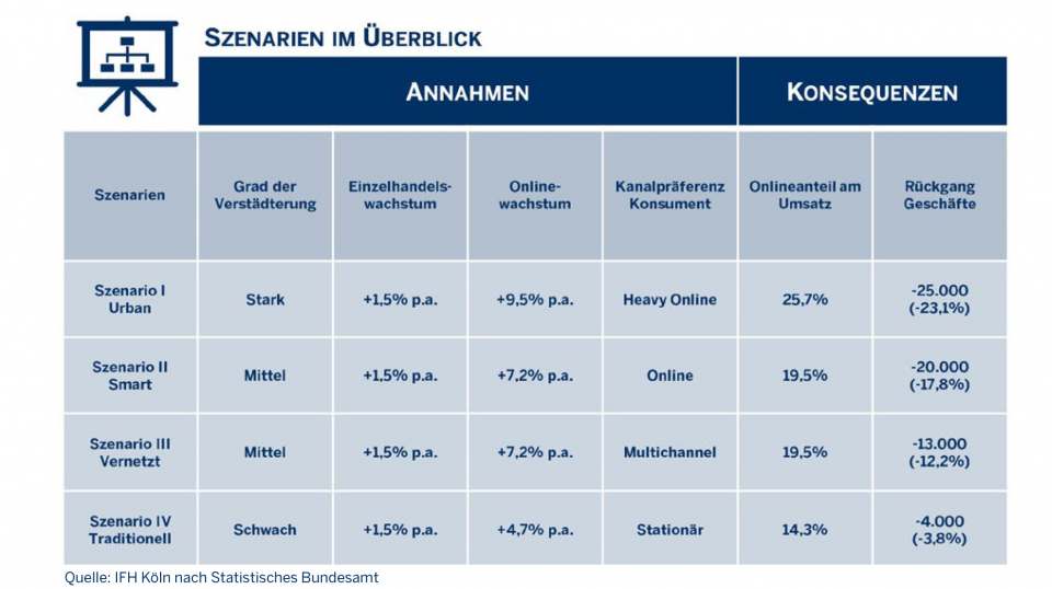 In der von Boris Hedde und Dr. Markus Preißner vom IFH Köln vorgestellten Studie „Handelsszenarien NRW 2030“ wurden Prognosen für vier mögliche Entwicklungen von Handel und Städten bis zum Jahr 2030 hergeleitet. Als wahrscheinlichste Entwicklung stellen sich dabei die Szenarien „Der smarte Handel“ und „Der vernetzte Handel“ dar, die allerdings beide von einer signifikant sinkenden Anzahl an Geschäften ausgehen. In diesen Szenarien ist mit einem Rückgang der Geschäfte in NRW um bis zu 20.000 zu rechnen, das negativste Szenario geht gar von einem Rückgang von über 25.000 aus.