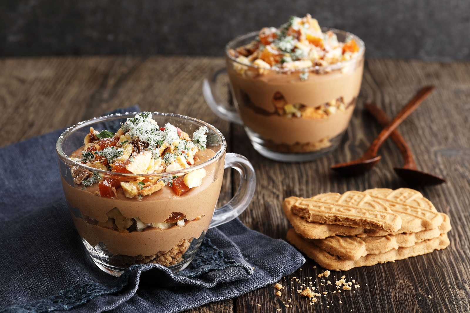 - Die gedörrten Früchte klein schneiden. Abwechselnd Früchte, Spekulatius, Creme und Kräuterzucker schichten, so dass mehrere Schichten entstehen. Mit Dörrfrüchten und Kräuterzucker abschließen.