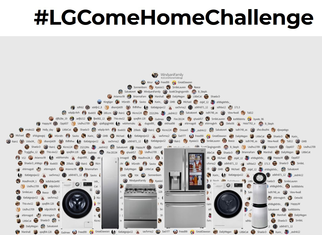 Auf seinen Social-Media-Kanälen ruft LG seine Followers dazu auf, an der #LGComeHomeChallenge teilzunehmen. Dabei werden Konsumenten dazu eingeladen, kurze Videos zu erstellen und zu teilen. Die Videos sollen zeigen, wie sie gerne zuhause mit der Familie, Freunden, Partnern oder auch Alleine leben – beispielsweise beim Essen, Spielen, Lachen oder auch Genießen.
