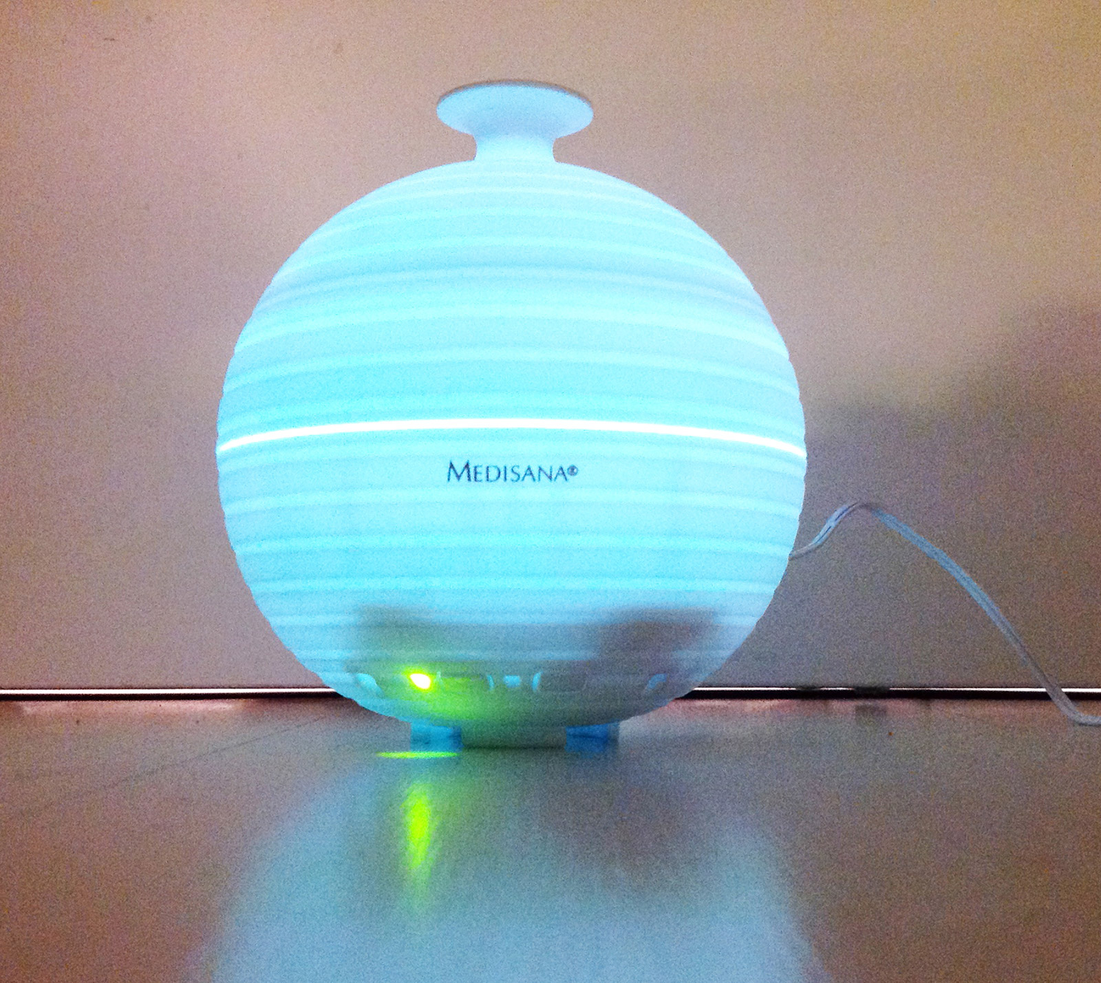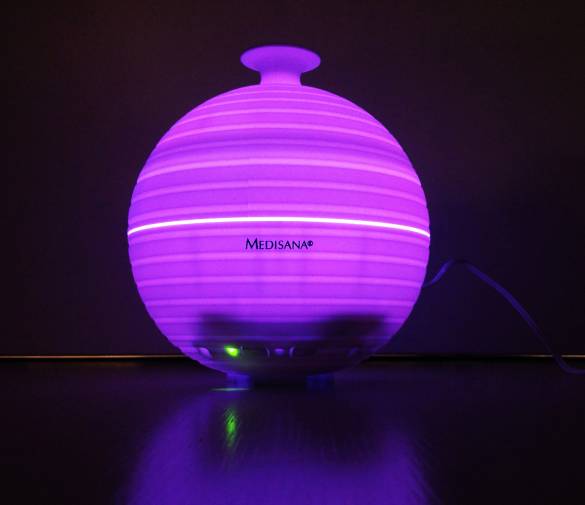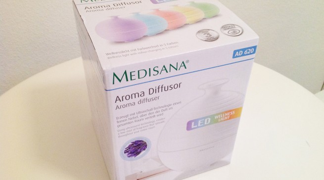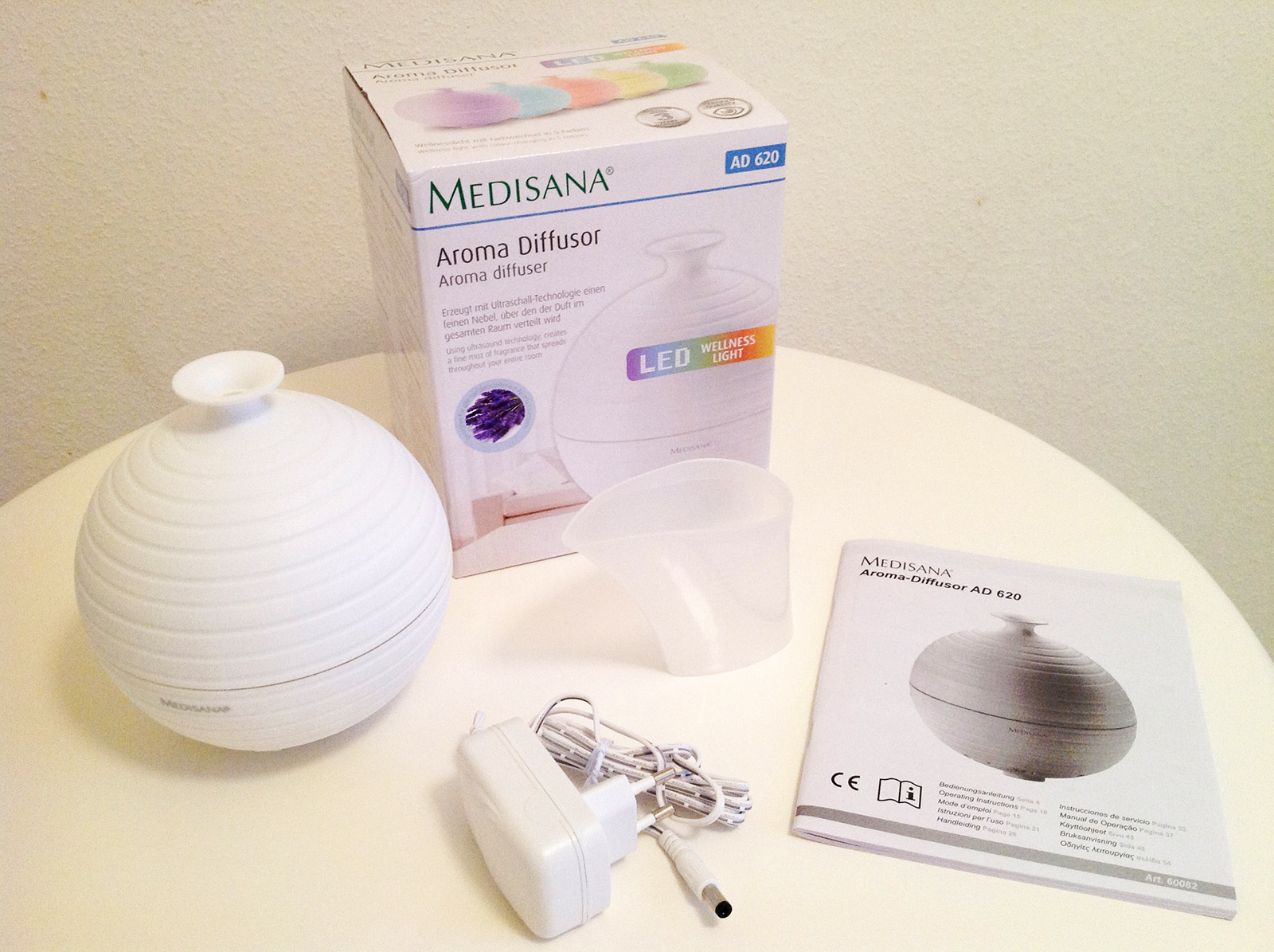 Als erstes habe ich den Aroma-Diffusor mit LED Wellness Light getestet. Es handelt sich dabei um eine Art “Raumbedufter”, der dem Aromatisieren der Luft in geschlossenen Innenräumen dient und der für alle handelsüblichen Aroma Essenzen geeignet ist, also beispielsweise Duftöle, die man auch für Duftlampen o.ä. verwendet. Der Medisana Aroma-Diffusor erzeugt mit Ultraschall-Technologie einen feinen Nebel, über den der Duft im gesamten Raum verteilt wird. Die mikrofeine Zerstäubung sorgt dabei für eine hohe Wirksamkeit. Ein integrierter Timer sorgt dafür, dass sich das Gerät wahlweise nach zwei oder vier Stunden abschaltet und sollte der Wassertank einmal leer sein, so schaltet eine Sicherheitsautomatik es ebenfalls ab. Unterstrichen wird das Ganze durch das eingebaute LED Wellness Light: ein Farbspiel, welches den kugelförmigen Diffusor in fünf verschiedenen Farben erstrahlen lässt (wahlweise alle nacheinander im sanften Übergang oder nur eine Lieblingsfarbe). Die dezente Aromadiffusion im Zusammenspiel mit dem sanften Licht soll zu einem angenehmen Raumklima und mehr Wohlfühl-Ambiente beitragen, so der Hersteller.