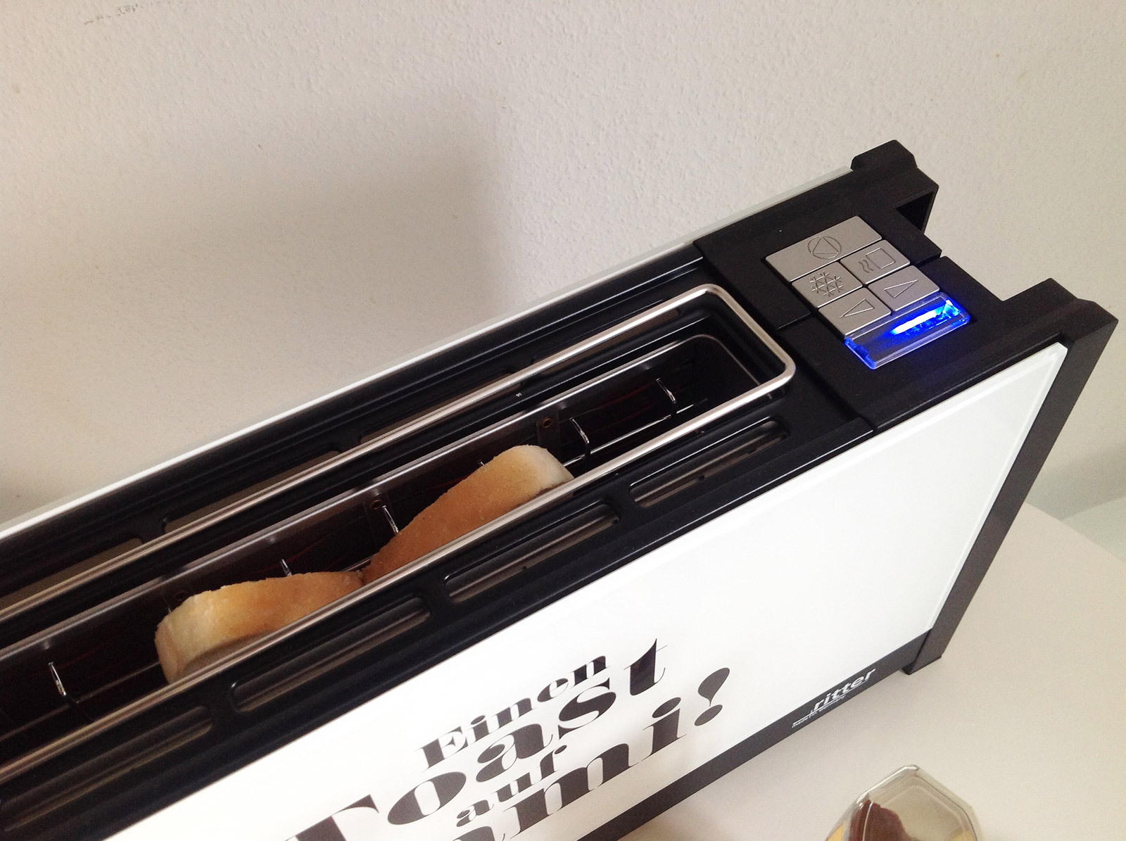 Mein erster Eindruck: als ich den ca. 3kg schweren, relativ großen Karton in den Händen halte: Mann, ist der schwer! Mein zweiter Eindruck, als ich den großen, dafür aber erstaunlich schmalen Toaster auspacke: Mann, ist der schön! 🙂 Das cleane Design gefällt mir außerordentlich gut und der schmale Toaster mit seinen glänzenden Glasfronten macht richtig was her. Die Optik des Toasters überzeugt sofort, gerade wenn man modernes, puristisches Design mag. Da ich ein absoluter Typografie-Fan bin, habe ich mich anlässlich des Muttertags-Themas für ein schwarz-weißes Design entschieden, das perfekt in unsere Küche passt: Die Vorderseite trägt die Aufschrift “Einen Toast auf Mami!”, was natürlich augenzwinkernd gemeint ist. Auf der Rückseite ist mittig ein kleiner schwarzer Stern aufgedruckt (Sterne gehen doch immer, oder? ;). Die Qualität des Drucks ist außerordentlich gut und ich bin beeindruckt, wie gestochen scharf die Buchstaben mit ihren feinen Serifen rüberkommen. Sehr schön!