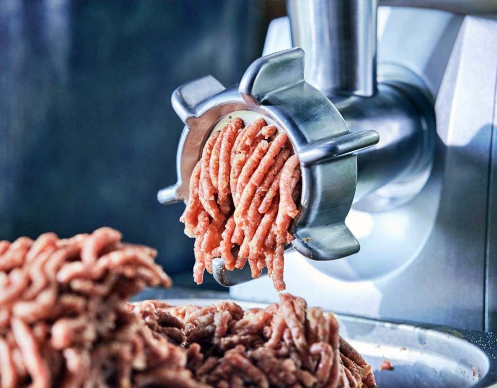 - Nach dem ersten Vermengen wechseln Sie die Lochscheibe im Fleischwolf auf die mittlere Größe und geben die gesamte Mischung noch einmal durch den Fleischwolf.