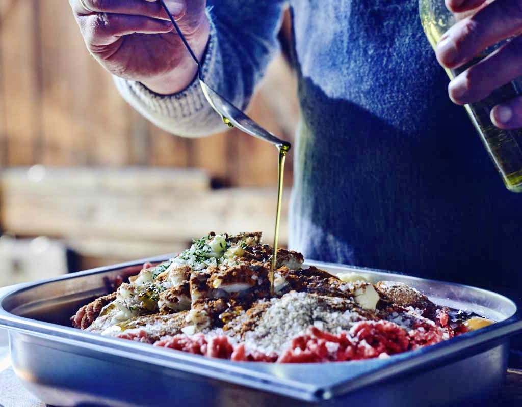 - 2 | Dann wird das Fleisch gewolft, anschließend mit allen anderen Zutaten in einer großen Schüssel miteinander vermengt.