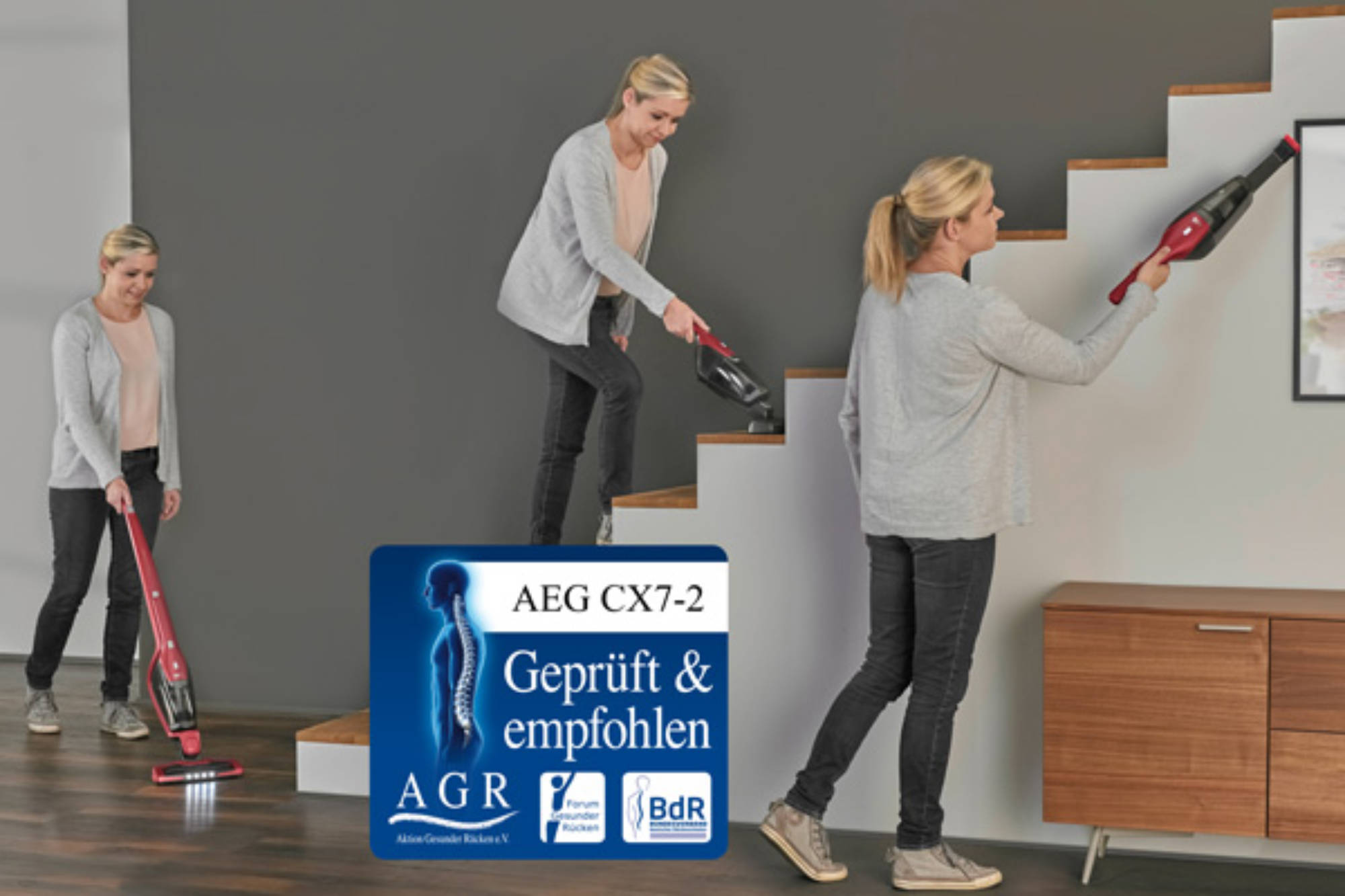 Entspannter Saugen: Die beiden AEG-Akku-Handstaubsauger FX9 und CX7-2 sowie der Bodenstaubsauger VX9-4 haben von der Aktion „Gesunder Rücken“ ein Gütesiegel erhalten. Damit sind die Akku-Geräte die ersten kabellosen Staubsauger, die von Ärzten und Therapeuten ausdrücklich empfohlen werden.