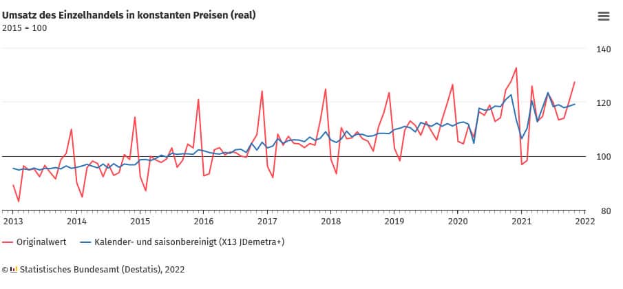 Im November 2021 haben die Einzelhandelsunternehmen in Deutschland nach vorläufigen Ergebnissen kalender- und saisonbereinigt real (preisbereinigt) 0,6% und nominal (nicht preisbereinigt) 1,1% mehr umgesetzt als im Oktober 2021. Im Vergleich zum Vorkrisenmonat Februar 2020 war der Einzelhandelsumsatz real 5,9% höher. Gegenüber dem Vorjahresmonat November 2020 sank der Umsatz real um 2,9%, stieg allerdings nominal um 0,2%. Ursachen für den realen Umsatzrückgang im Vergleich zum Vorjahresmonat könnten die Lieferengpässe im Einzelhandel sowie der starke Anstieg der Einzelhandelspreise sein.