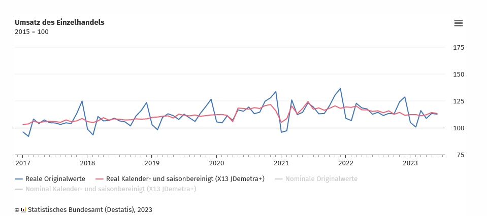Die Einzelhandelsunternehmen in Deutschland haben nach vorläufigen Ergebnissen des Statistischen Bundesamtes (Destatis) im 1. Halbjahr 2023 real (preisbereinigt) 4,5% weniger umgesetzt als im 1. Halbjahr 2022. Im Vergleich hierzu stiegen die nominalen (nicht preisbereinigten) Umsätze um 3,6% gegenüber dem Vorjahreszeitraum. Die Differenz zwischen den nominalen und realen Ergebnissen spiegelt das deutlich gestiegene Preisniveau im Einzelhandel wider.