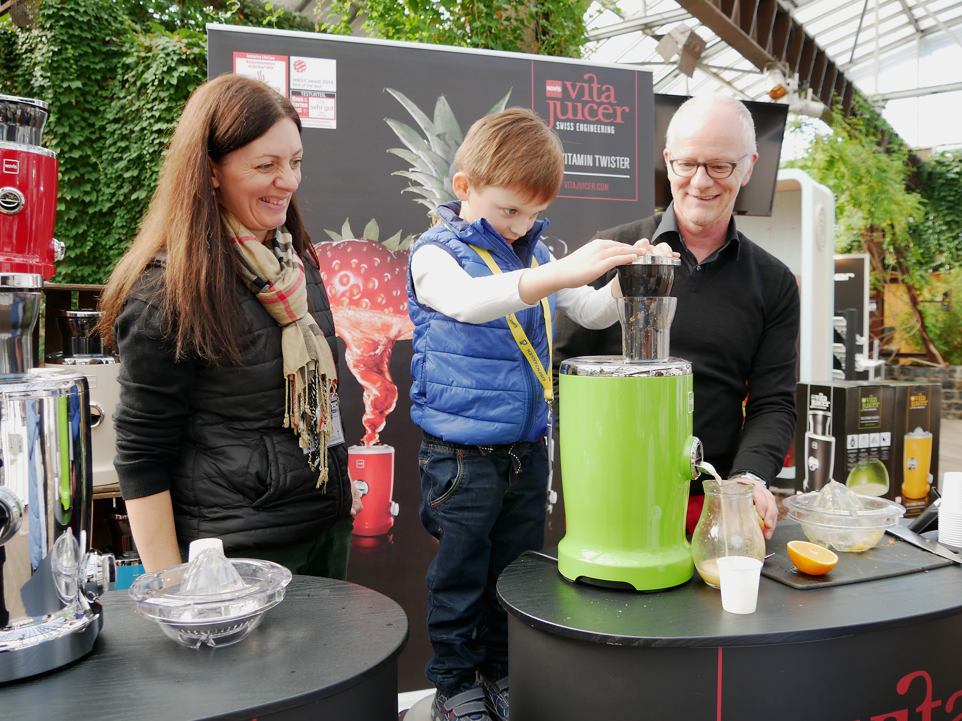 Nach der Theorie ist erst mal der Genuss dran: Thomas Bald versorgt uns an seiner Vitamin-Tankstelle von „Novis“ mit dem VitaJuicer mit reichlich Obst und Gemüse in flüssiger Form. Nach all’ den Hochleistungsmixern, die in Berlin auf Watt komm raus um die Wette lärmten, hat das Entsaften mit dem design- und farbenstarken Multifunktionsentsafter, fast was Meditatives. Der VitaJuicer kann entsaften, pressen und pürieren. Zudem bewirkt die Kombination aus Zentrifuge und Presse eine besonders sämige Saftkonsistenz. So sollen laut Hersteller 20% mehr Nährstoffe im Saft verbleiben.