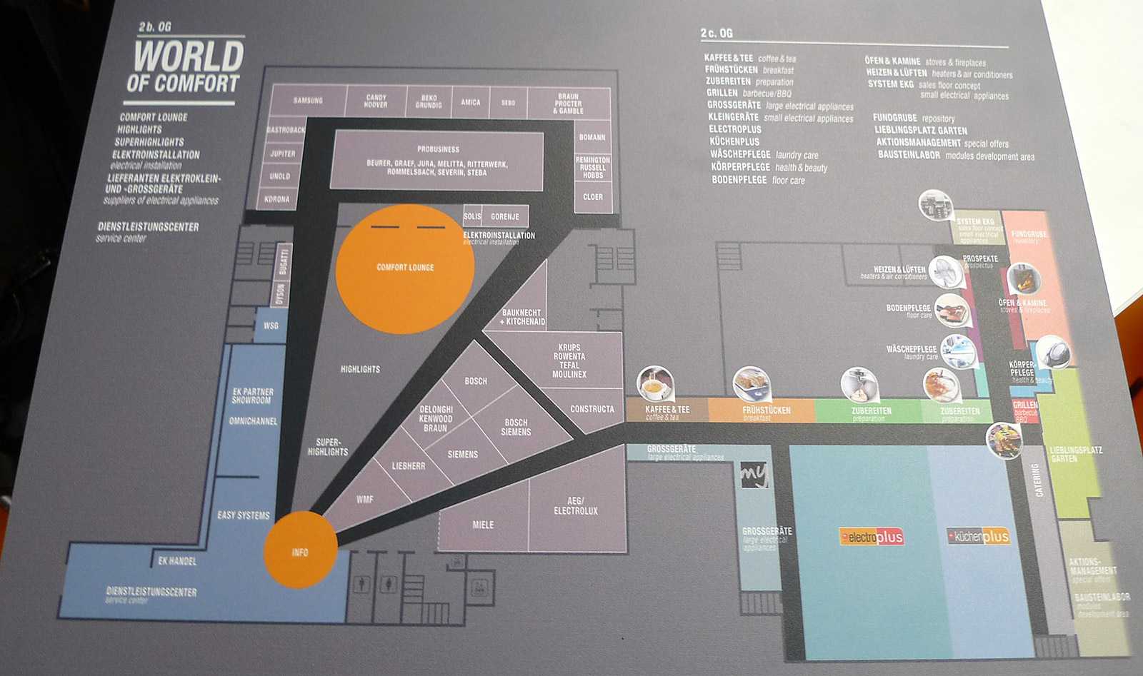 Zwar bildet das Konzept electroplus 3.0 das neue Herzstück der „World of Comfort“, doch mit dem Neuauftritt der EK können sich auch die Lieferanten nun frischer, lebendiger und markenadäquater darstellen. Der ProBusiness-Campus ist deutlich übersichtlicher und offener geworden. Großzügiger auch die Gänge und Laufwege. Alles in allem ein gelungener Wurf, der das bisher vertraute Bild schnell vergessen lässt.