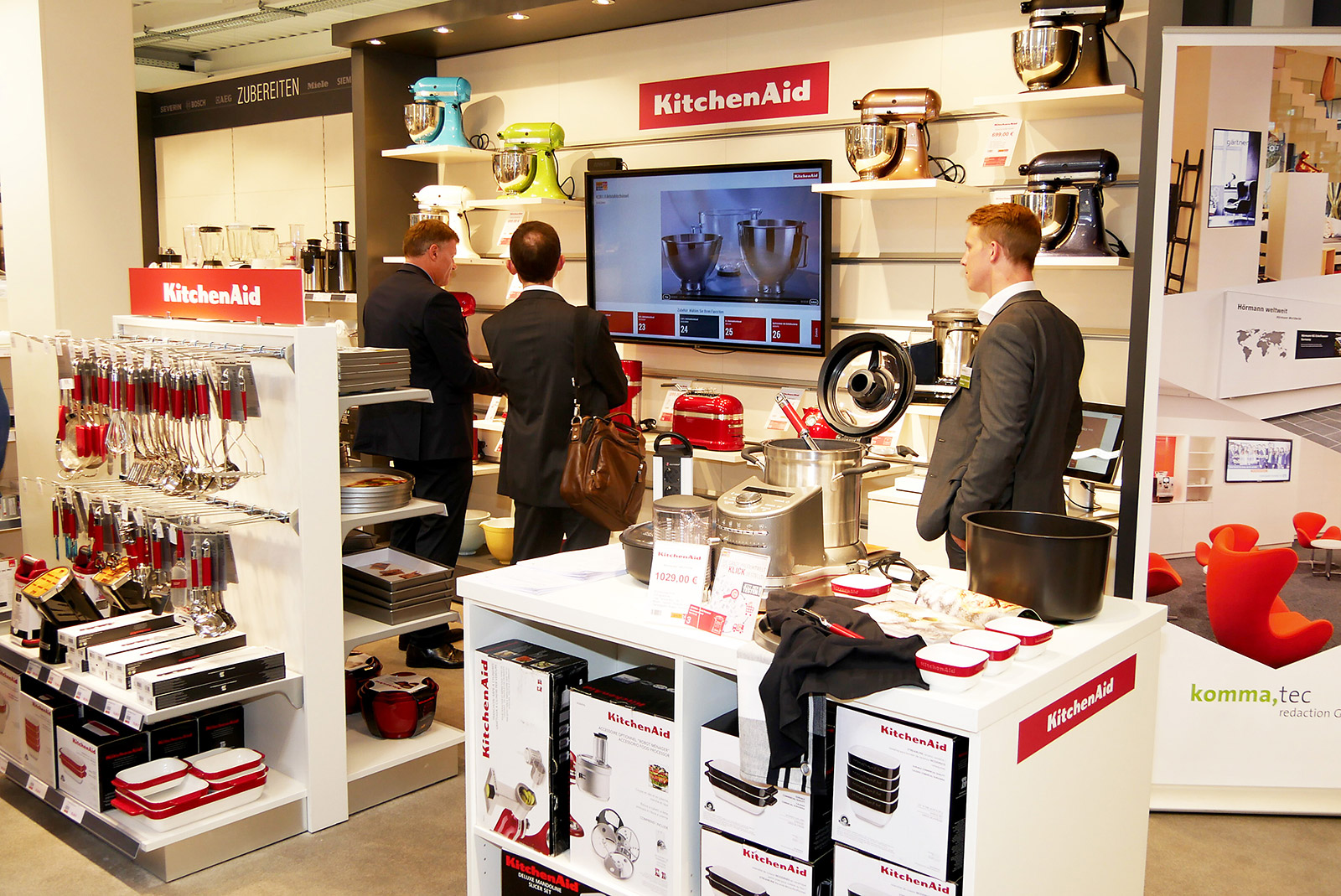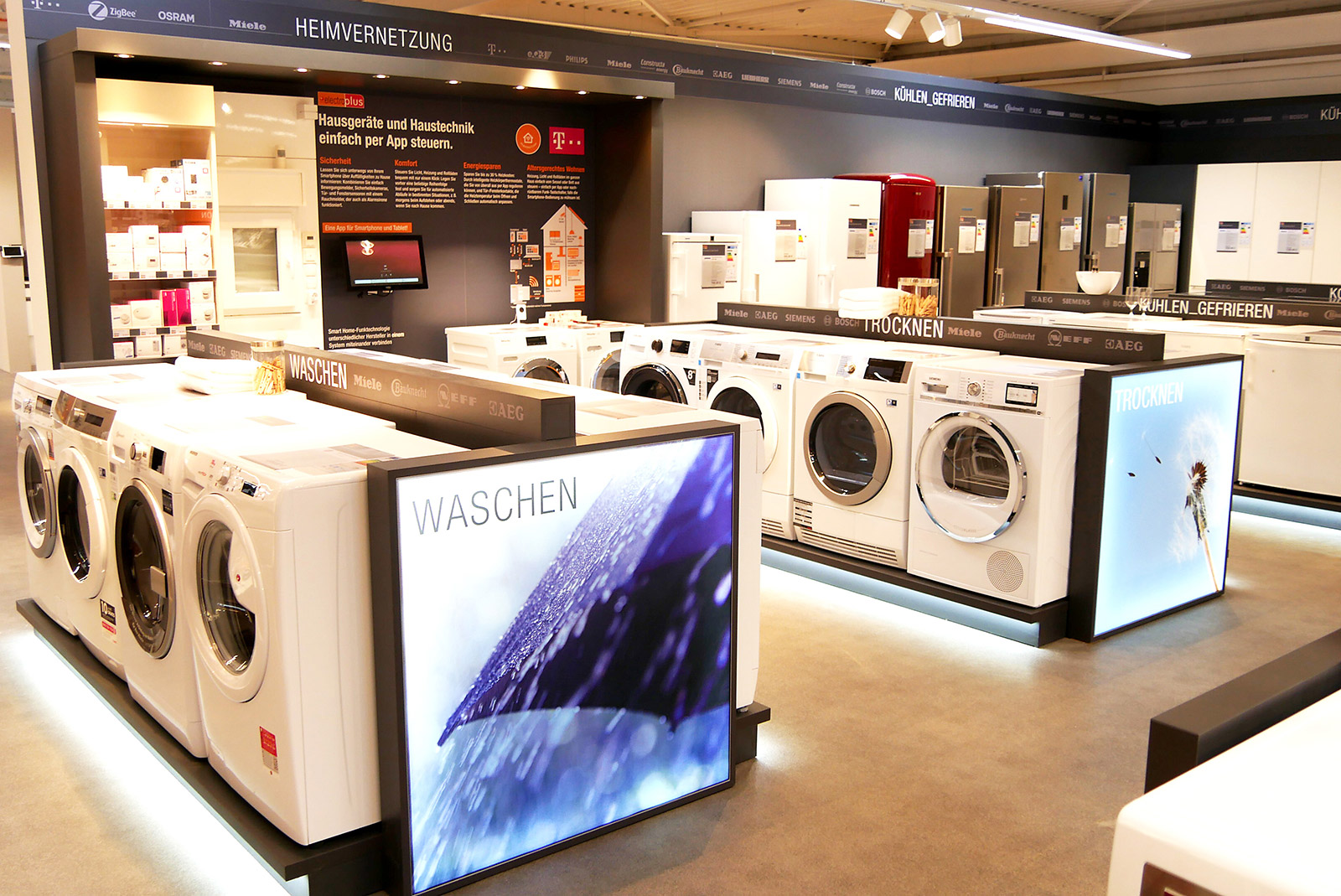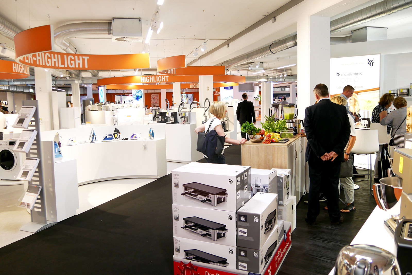 Darüber hinaus gab es noch vielfältige „analoge“ Feinheiten wie beispielsweise kleine Griffmulden im Präsentationsmöbel, um ein Induktionsfeld schnell und kundenfreundlich zu präsentieren. Helle Leuchtbanner an den Regalfronten signalisieren auf den ersten Blick das zugehörige Sortiment und auch die Heimvernetzung kann nun großzügig demonstriert werden.