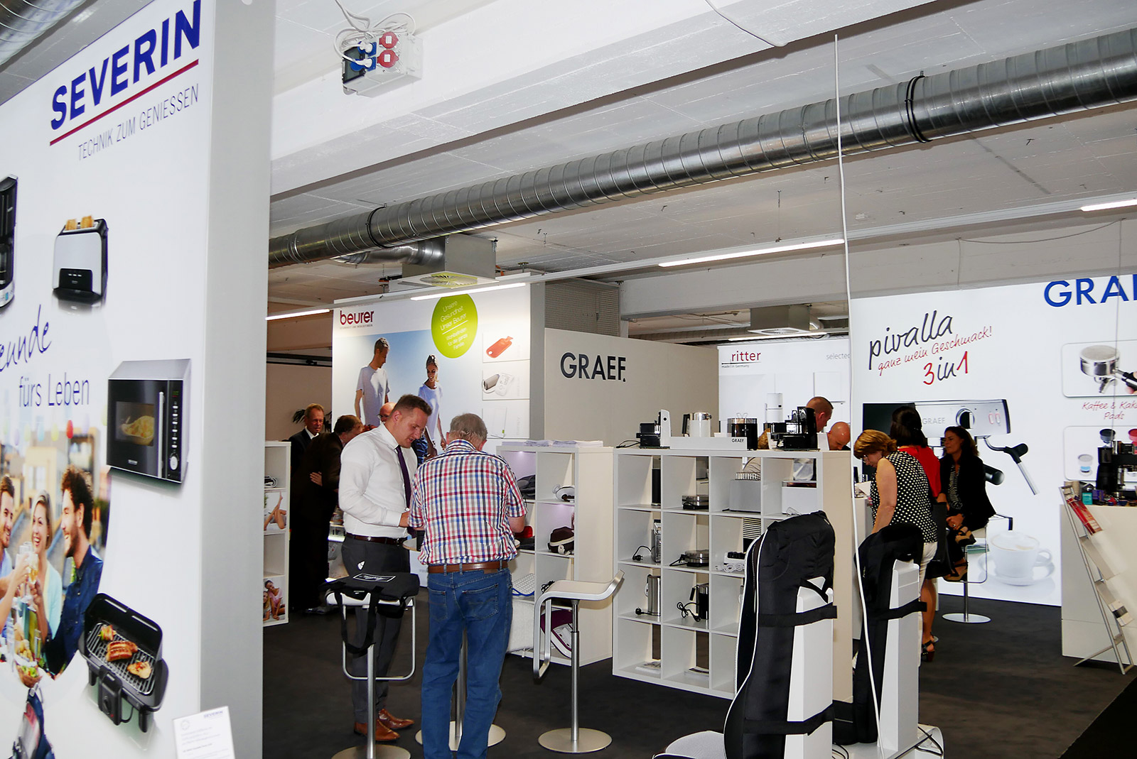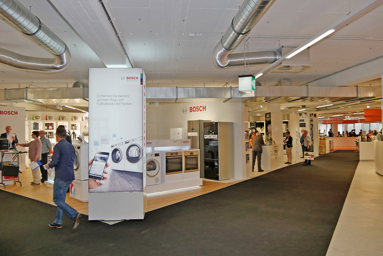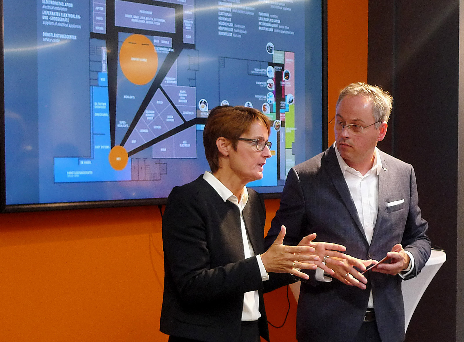 Darüber hinaus gab es noch vielfältige „analoge“ Feinheiten wie beispielsweise kleine Griffmulden im Präsentationsmöbel, um ein Induktionsfeld schnell und kundenfreundlich zu präsentieren. Helle Leuchtbanner an den Regalfronten signalisieren auf den ersten Blick das zugehörige Sortiment und auch die Heimvernetzung kann nun großzügig demonstriert werden.