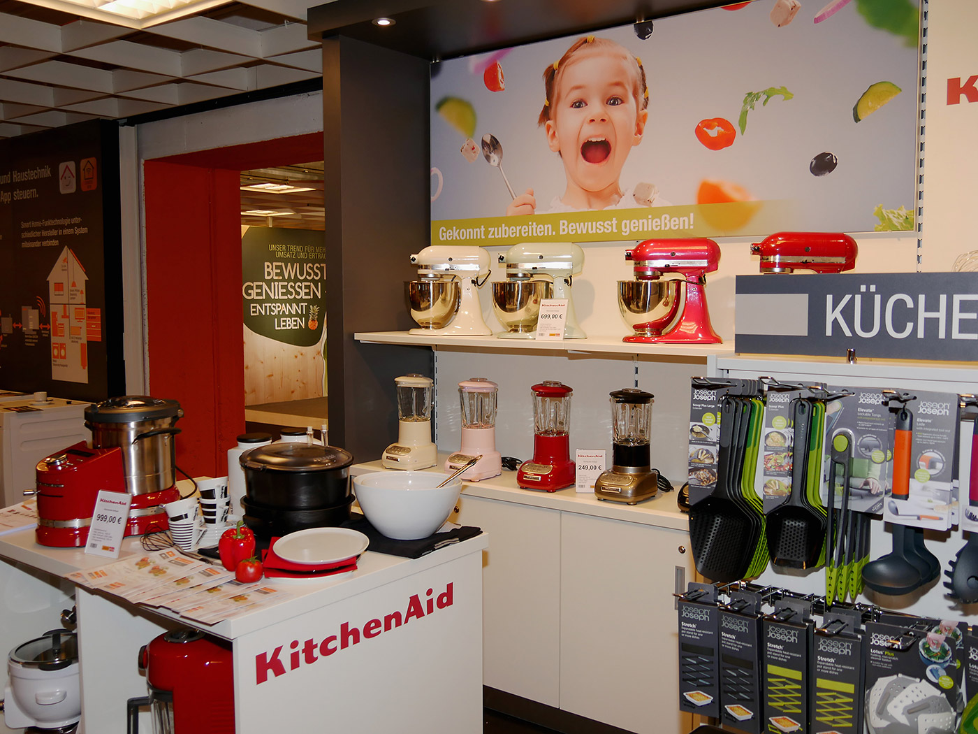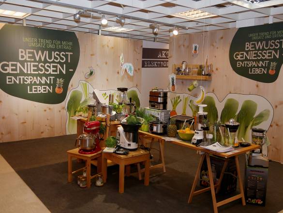 Fast zwangsläufig denkt man bei diesen Farbwelten an Innendekoration oder auch an Geschenkartikel. Doch auch Elektrogroß- und Kleingeräte sind ganz gezielt in diese Sehnsuchtswelten eingebunden. So findet das EK-Fokusthema „Bewusst Genießen“ seinen Widerhall bei „Fresh Kitchen“ und – wie könnte es nicht anders sein – die entsprechende Präsentation erstrahlt in fruchtigen Farben.