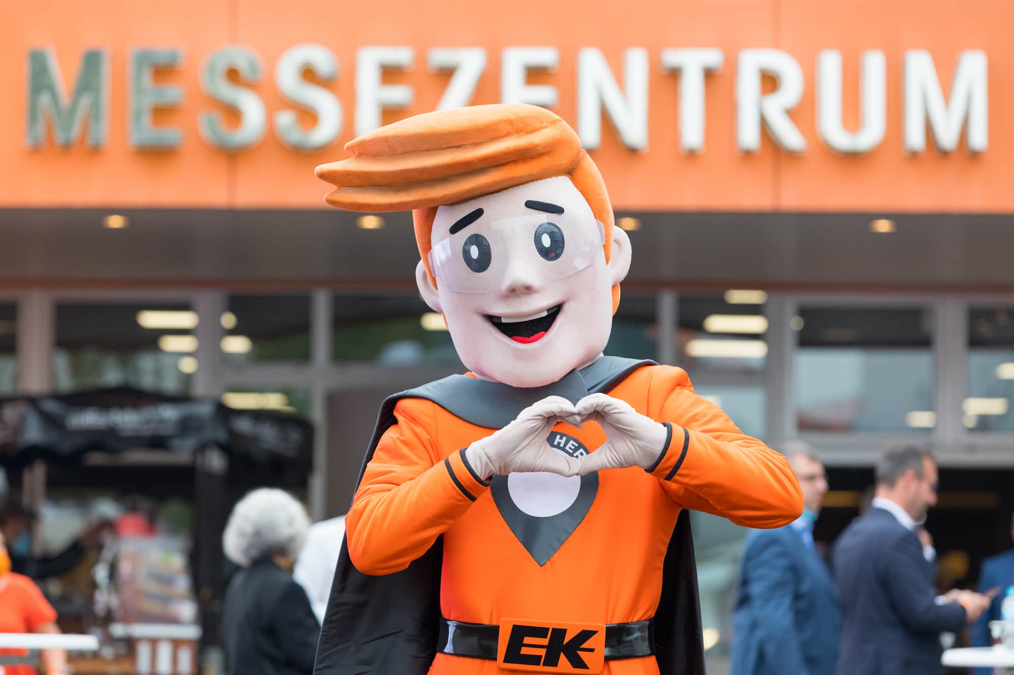 „Local Hero“, das Messe-Maskottchen der EK/servicegroup, freut sich auf die Besucher der ersten Branchenmesse im Jahr 2022.