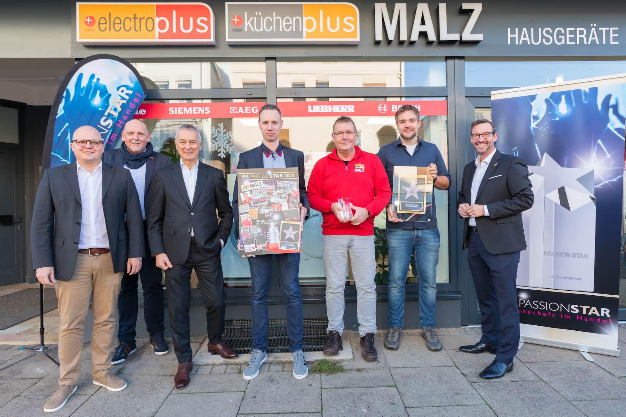 EK Passion Star-Übergabe. Unser Foto zeigt v.l.n.r.: Vorstandsmitglied Jochen Pohle, Regionalleiter Dirk Borutta, Jury-Mitglied Klaus Schmelzeisen, das Team von electroplus küchenplus Malz mit Andre Beljan, Joachim und Marcel Malz sowie Martin Wolf, Leiter Vertrieb und Marketing Elektro/Küche/Licht.