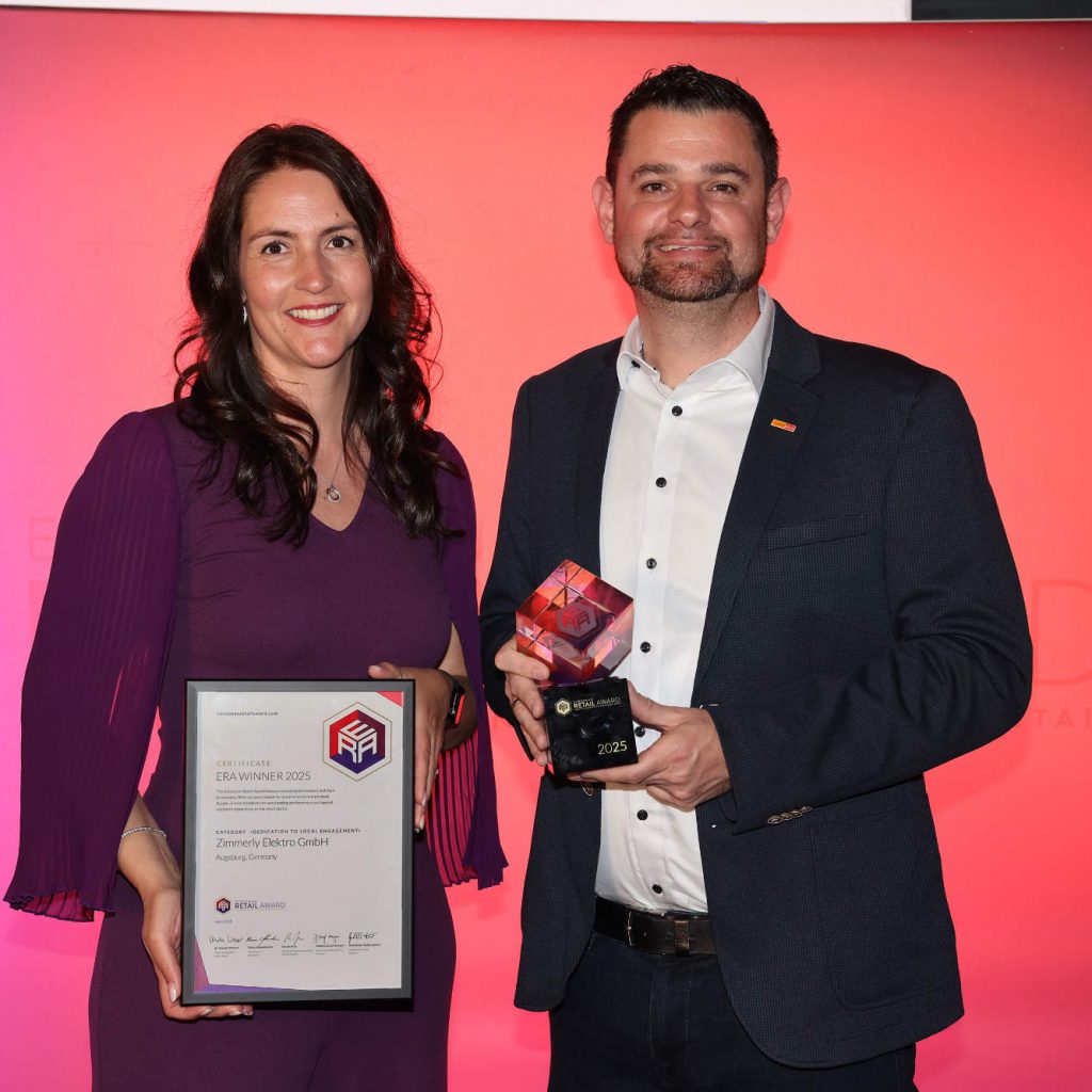 Der Award „Dedication to local engagement” konnten Tanja und Bernd Zimmerly aus den Händen von Klaus Schmelzeisen entgegennehmen. Der Handelsexperte aus Montabaur hob in seiner Laudatio die überzeugende Kombination aus außergewöhnlichem Kundenservice und großem Einsatz für die Menschen in der Region hervor. „Von der modernisierten Zentrale über Nachhaltigkeitsinitiativen bis hin zur Förderung der Mitarbeiter und der Unterstützung der lokalen Bevölkerung – das Engagement für das Geschäft und die Gemeinschaft ist beispielhaft.“