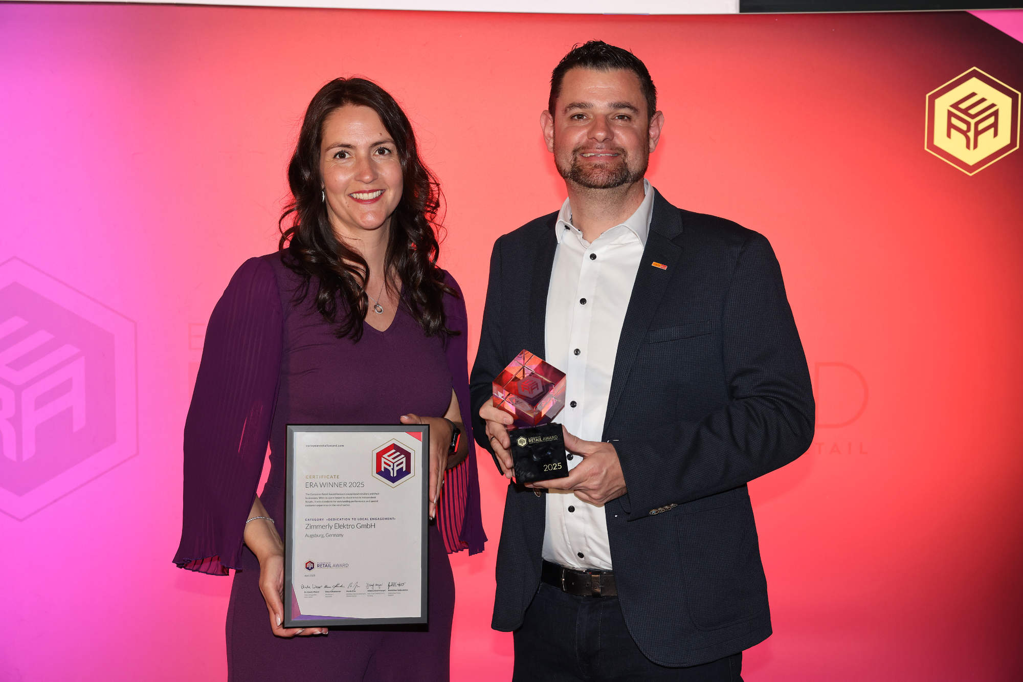 Mit der neuen Auszeichnung erweitert EK im Jahr des 100-jährigen Bestehens den Kreis der europäischen Bewerber auch auf nicht-kooperierte Händler, die mit besonderen unternehmerischen Aktivitäten Zeichen in hart umkämpften Märkten setzen. Der Award „Dedication to local engagement” wurde an Tanja und Bernd Zimmerly (electroplus Zimmerley, Augsburg) verliehen.