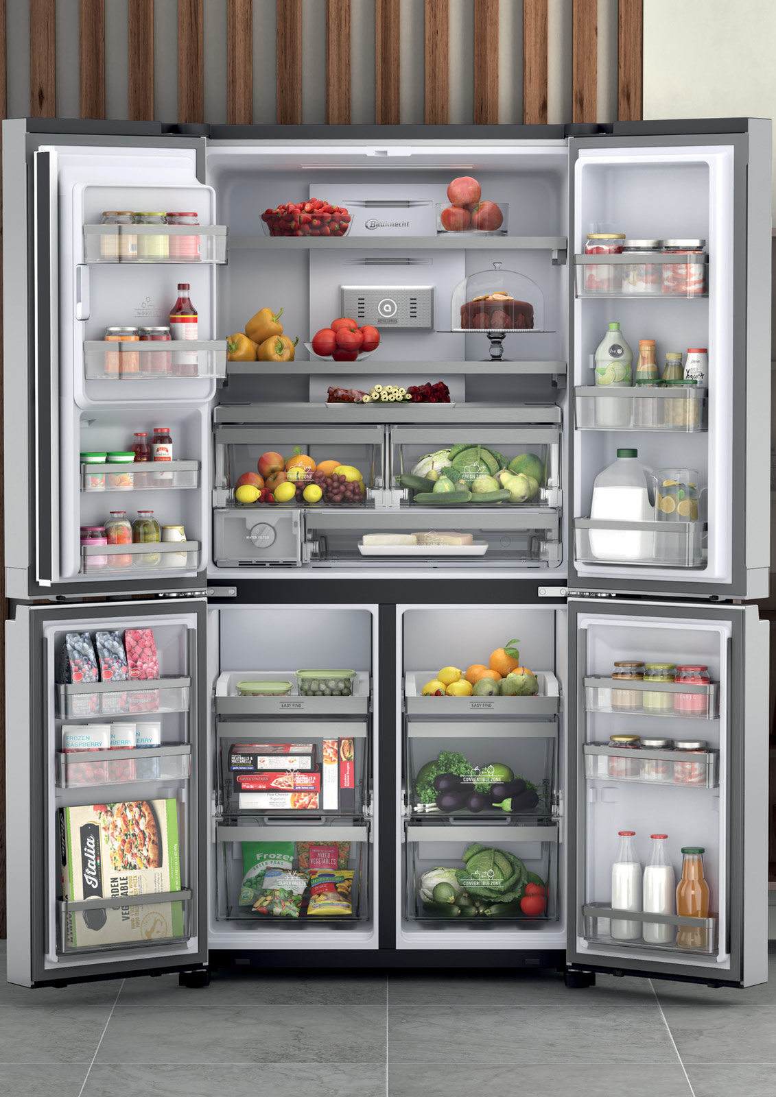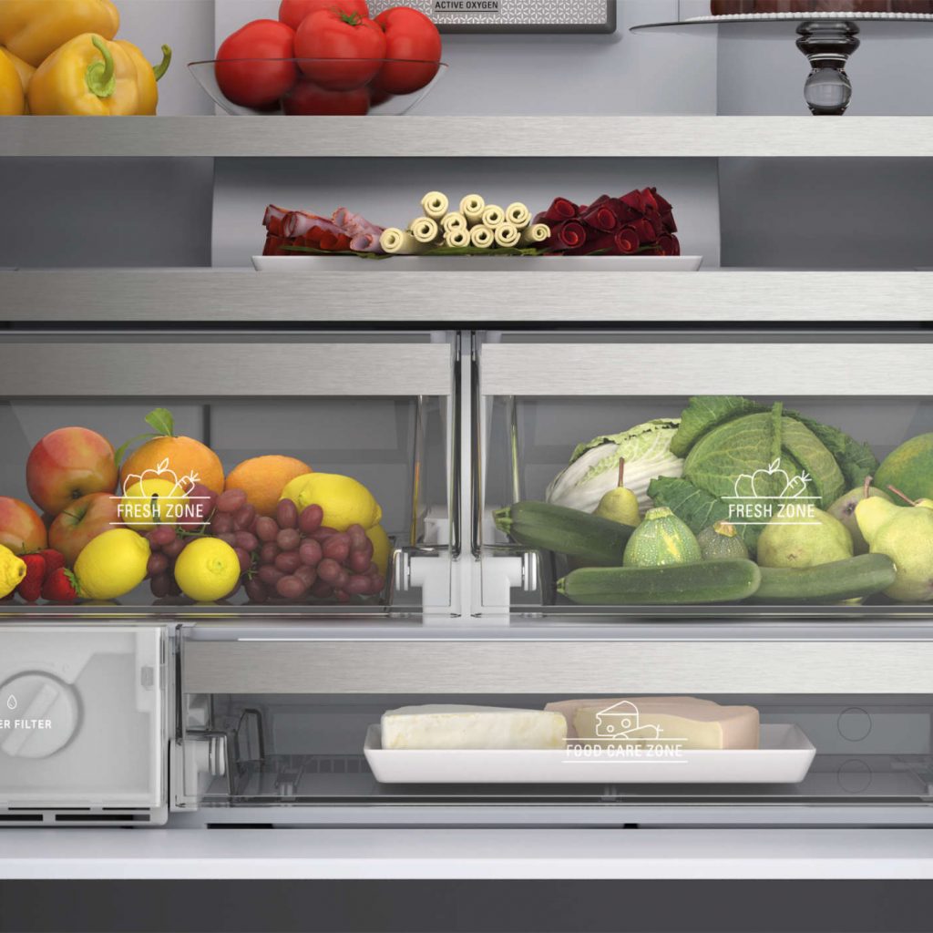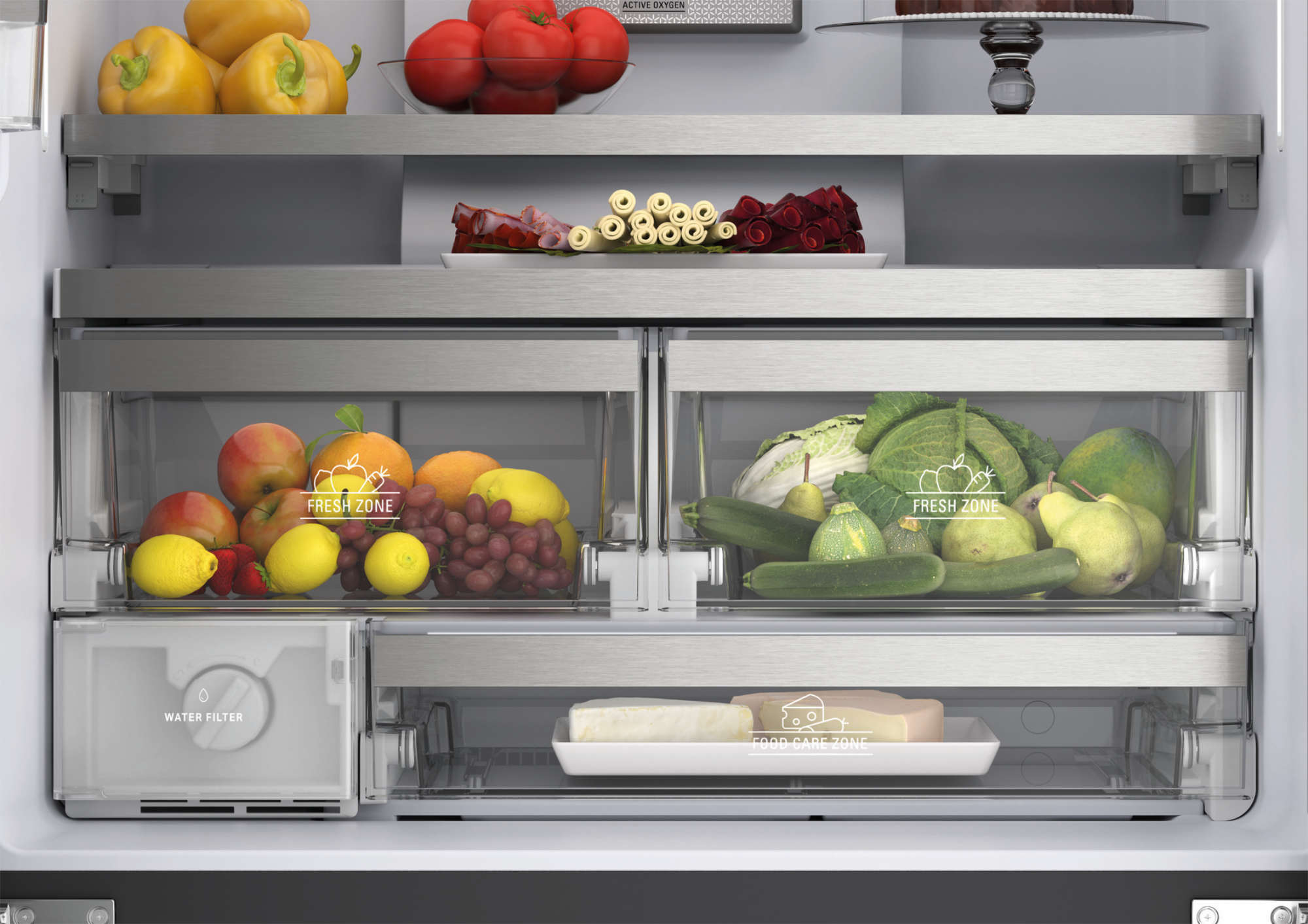 Eine besonders nachhaltige Aufbewahrung finden die Verbraucherinnen und Verbraucher in den Kühl-/Gefrierkombinationen der Total NoFrost-Reihe. Das Food Care System, eine perfekte Synergie innovativer Technologien, sorgt hier für eine optimale Lagerung sämtlicher Lebensmittel. Die Kühl-/Gefrierkombination Active Quattro bietet zudem eine extragroße Fläche: Mit bis zu 591 Litern Lagerkapazität bietet der Viertürer ausreichend Platz für so manchen Großeinkauf.
