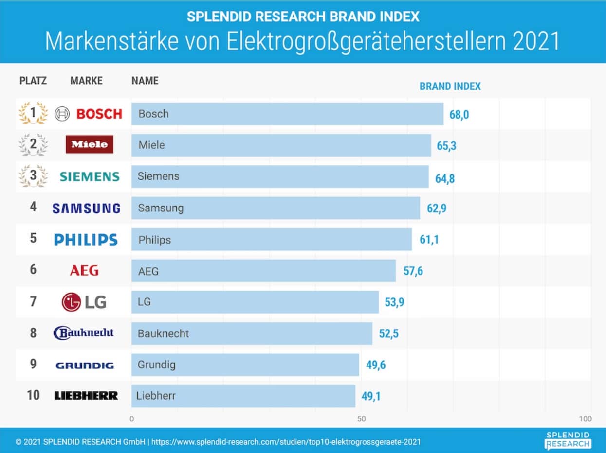 Miele und Siemens folgen in dem von Splendid Research durchgeführten Top-10-Ranking auf den Plätzen zwei und drei.