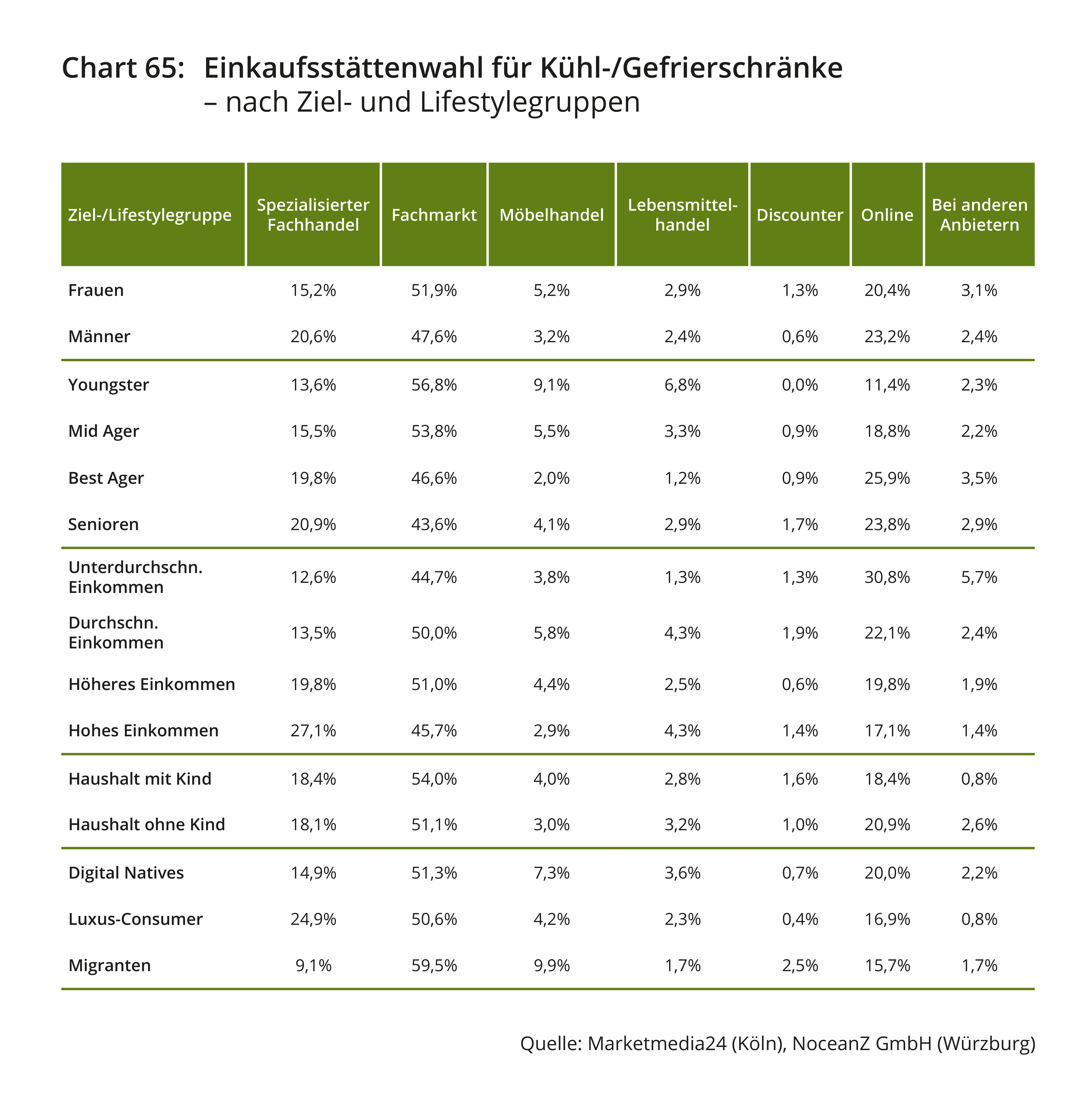 Konsumenten zwischen 18 und 80 Jahren, die in den letzten drei Jahren Haushaltsgroßgeräte gekauft haben bzw. in absehbarer Zeit kaufen wollen, beantworteten die Fragen der Marktforscher. Dabei stellte die für Handel und Industrie besonders interessante Zielgruppe der Mid Ager im Alter von 25 bis 49 Jahren rund 45 Prozent der Teilnehmer. Ergänzend zu Altersgruppen wurden die Kaufpräferenzen von Beziehern unterschiedlicher Einkommensklassen, von Haushalten mit und ohne Kinder sowie von Digital Natives, LuxusConsumern und Migranten analysiert.