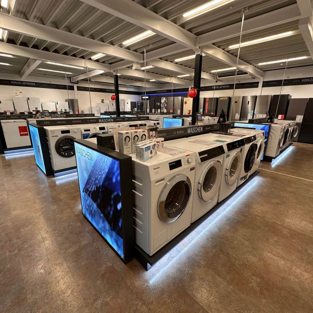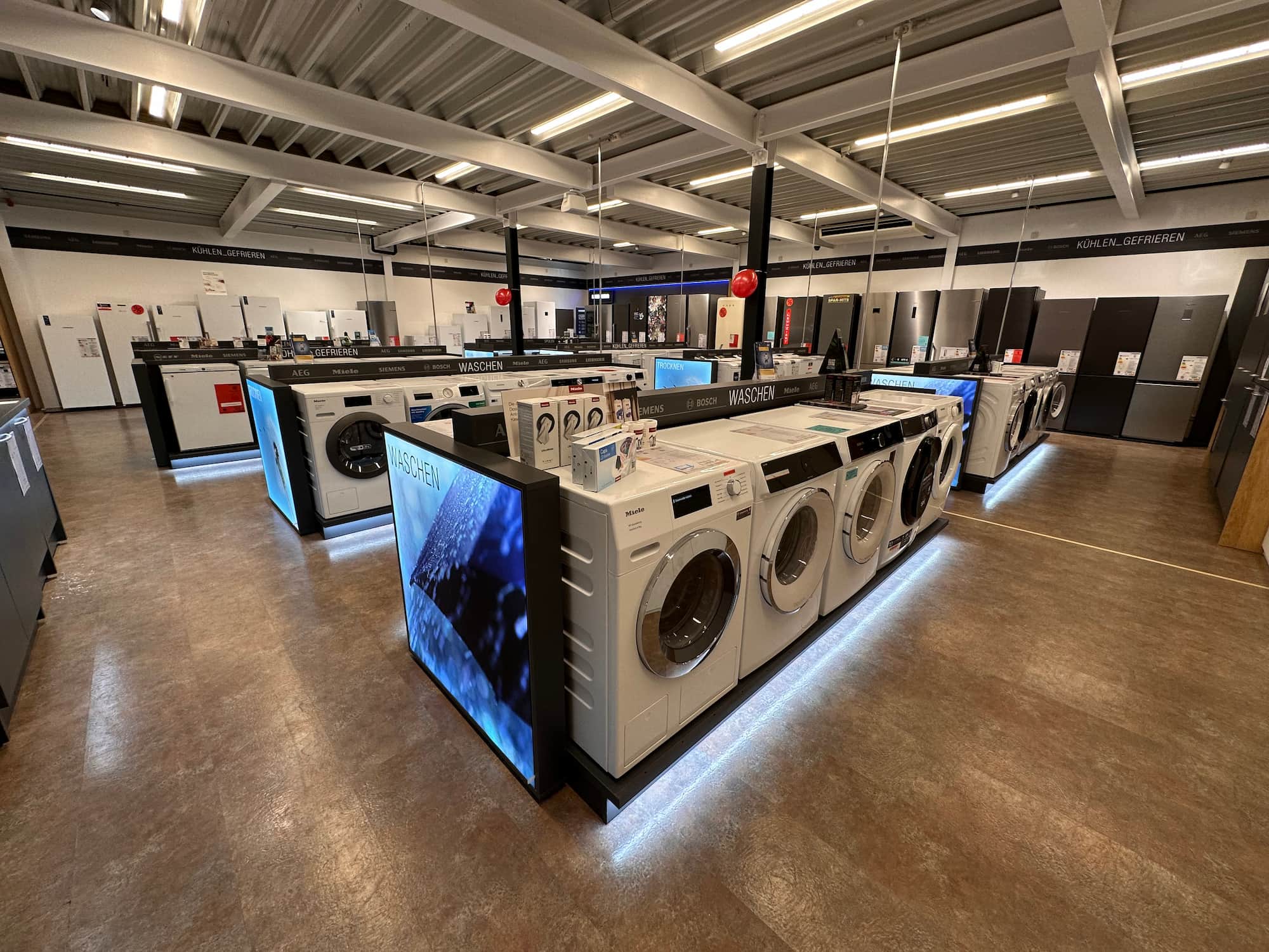 Die stylische Ladenbauarchitektur inszeniert die Elektrogroß- und -kleingeräte auf Themeninseln und sorgt damit direkt beim Betreten des Fachgeschäfts für klare Orientierung. Beim Rundgang durch die Ausstellung stößt der Kunde dann auf Marken wie AEG, Bosch, Constructa, Liebherr, Miele, Neff, Nivona, Samsung, Siemens oder Sebo.