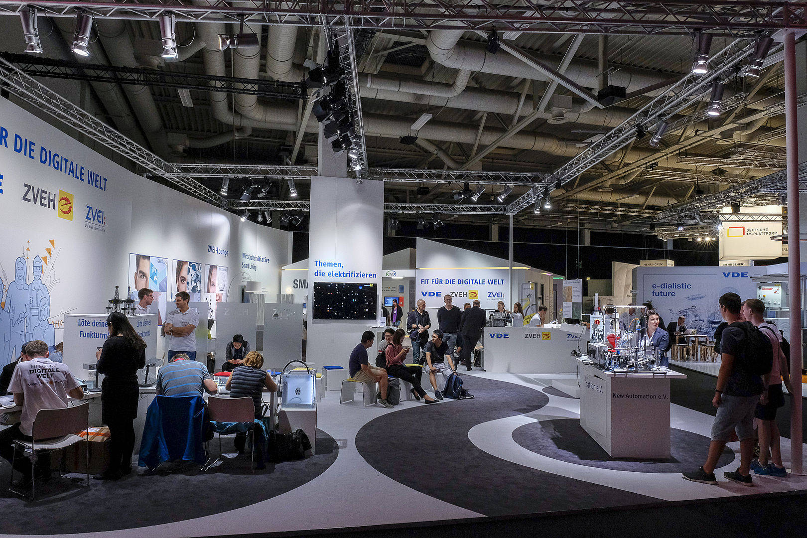 Wie smarte Technik helfen kann, ein Haus weitgehend energieautark und klimaneutral sowie obendrein sicherer, komfortabler und altersgerechter zu machen, zeigt das 100 Quadratmeter große begehbare „House of Smart Living“ des ZVEH. Ein weiterer Fokus liegt auf dem Thema „Smart Health“. Zu sehen sind beispielsweise ein Fußboden, der Stürze registriert oder eine Atemluftmessung für Diabetes-Patienten, die beide an eine Notruffunktion gekoppelt sind.