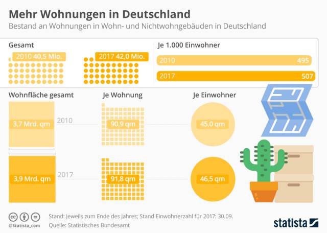 Ende 2017 gab es in Deutschland knapp 42,0 Millionen Wohnungen in Wohn- und Nichtwohngebäuden. Wie das Statistische Bundesamt (Destatis) weiter mitteilt, erhöhte sich damit der Wohnungsbestand im Vergleich zum Jahr 2010 um 3,7 % beziehungsweise um 1,5 Millionen Wohnungen. Im Vergleich zum Vorjahr stieg der Wohnungsbestand um 265 000 Wohnungen oder 0,6 %. Somit kamen Ende 2017 auf 1000 Einwohner 507 Wohnungen und damit 12 Wohnungen mehr als 7 Jahre zuvor (2010: 495 Wohnungen je 1000 Einwohner).