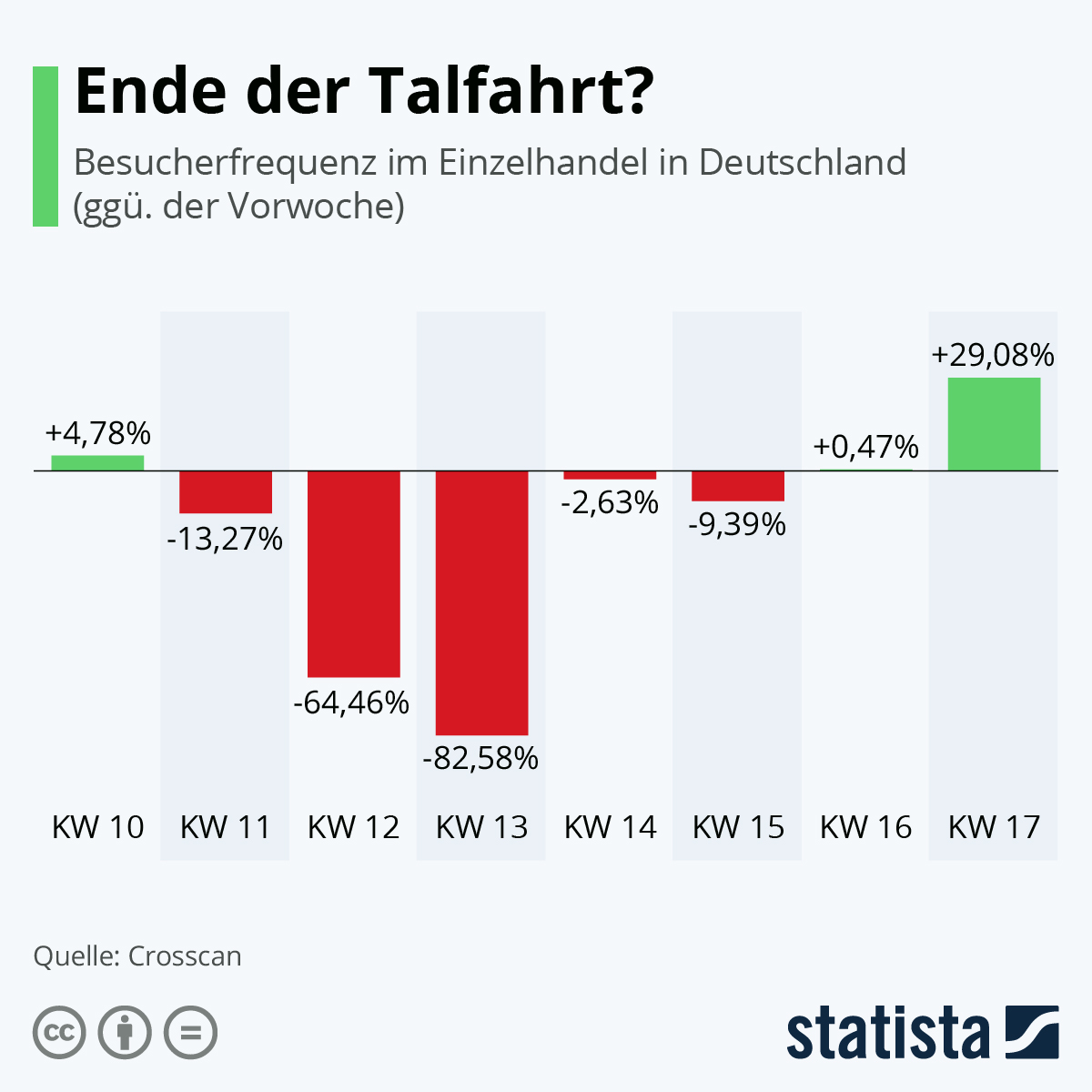 Eine Auswertung von Crosscan, Erfinder einer der ersten cloudbasierten Retail Analytics Plattformen, zeigt, wie stark die Besucherfrequenz im Einzelhandel in den vergangenen Wochen eingebrochen ist. Nun steigen die Besucherzahlen wieder an – in der vergangenen Kalenderwoche um rund 29 % gegenüber der Vorwoche, wie die aktuelle Statista-Grafik zeigt.